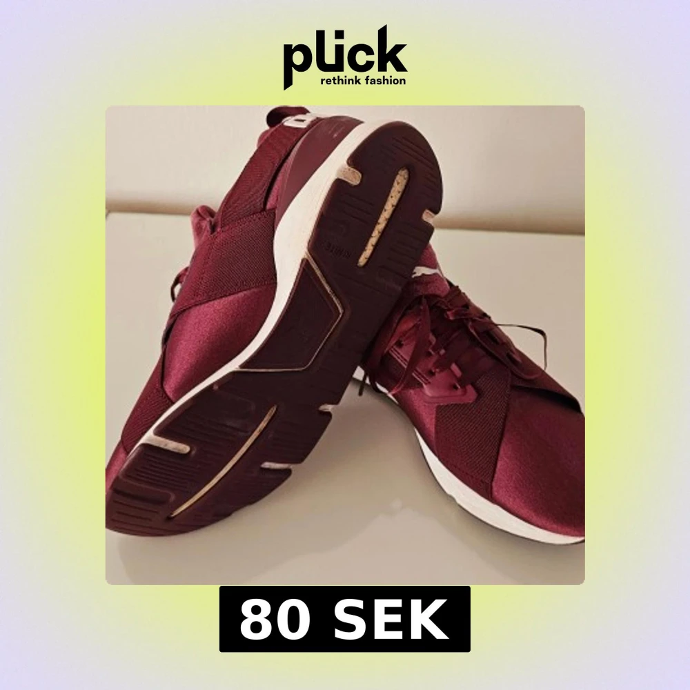 Snygga vinröda Puma sneakers med vit sula och klassisk logga på hälen och plösen. Skorna har snörning och är tillverkade i syntetmaterial med textil och mockadetaljer. Modern design med rund tå och platt sula, perfekt för dig som gillar sportig stil.