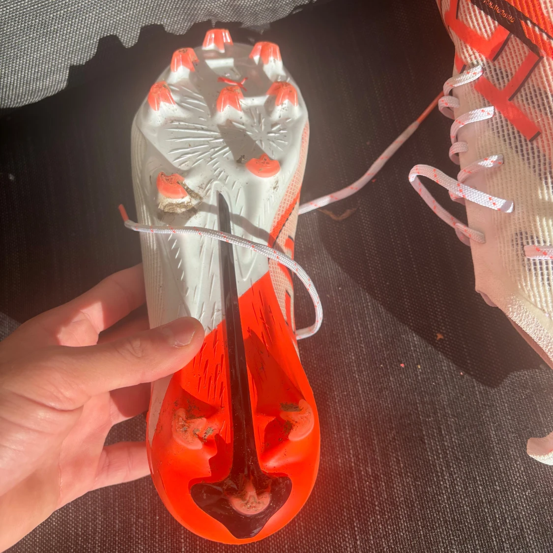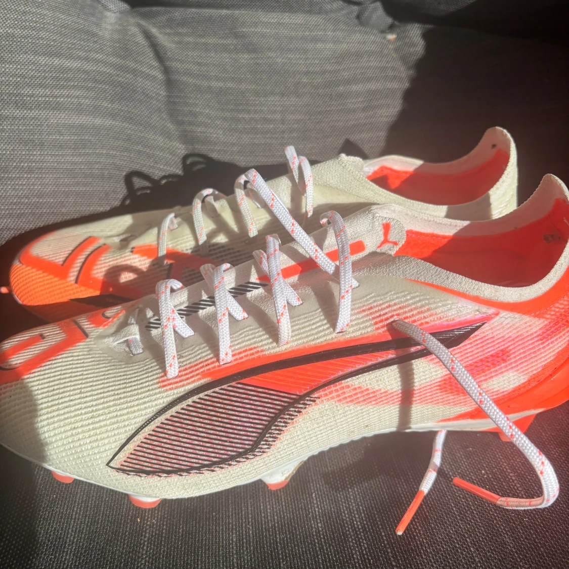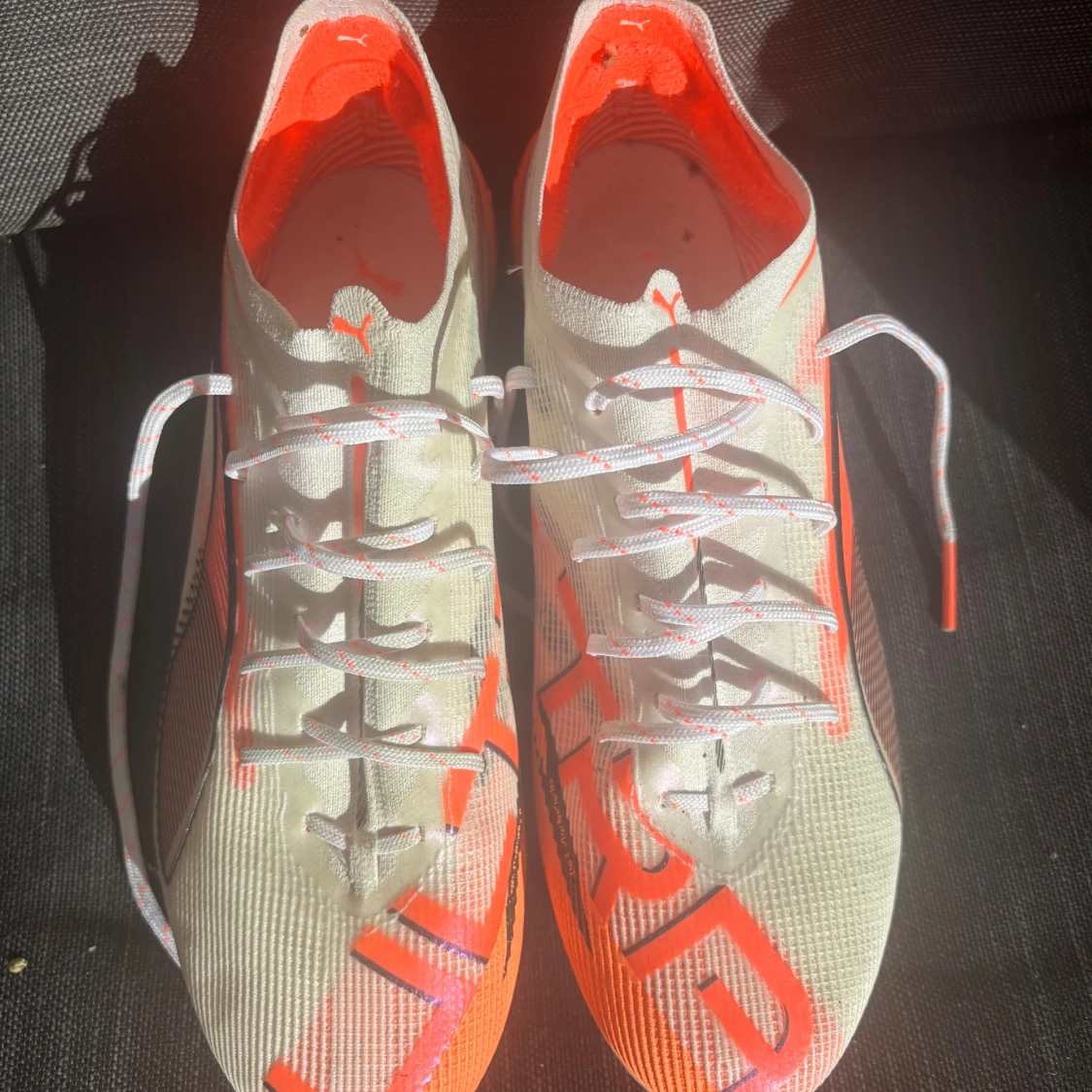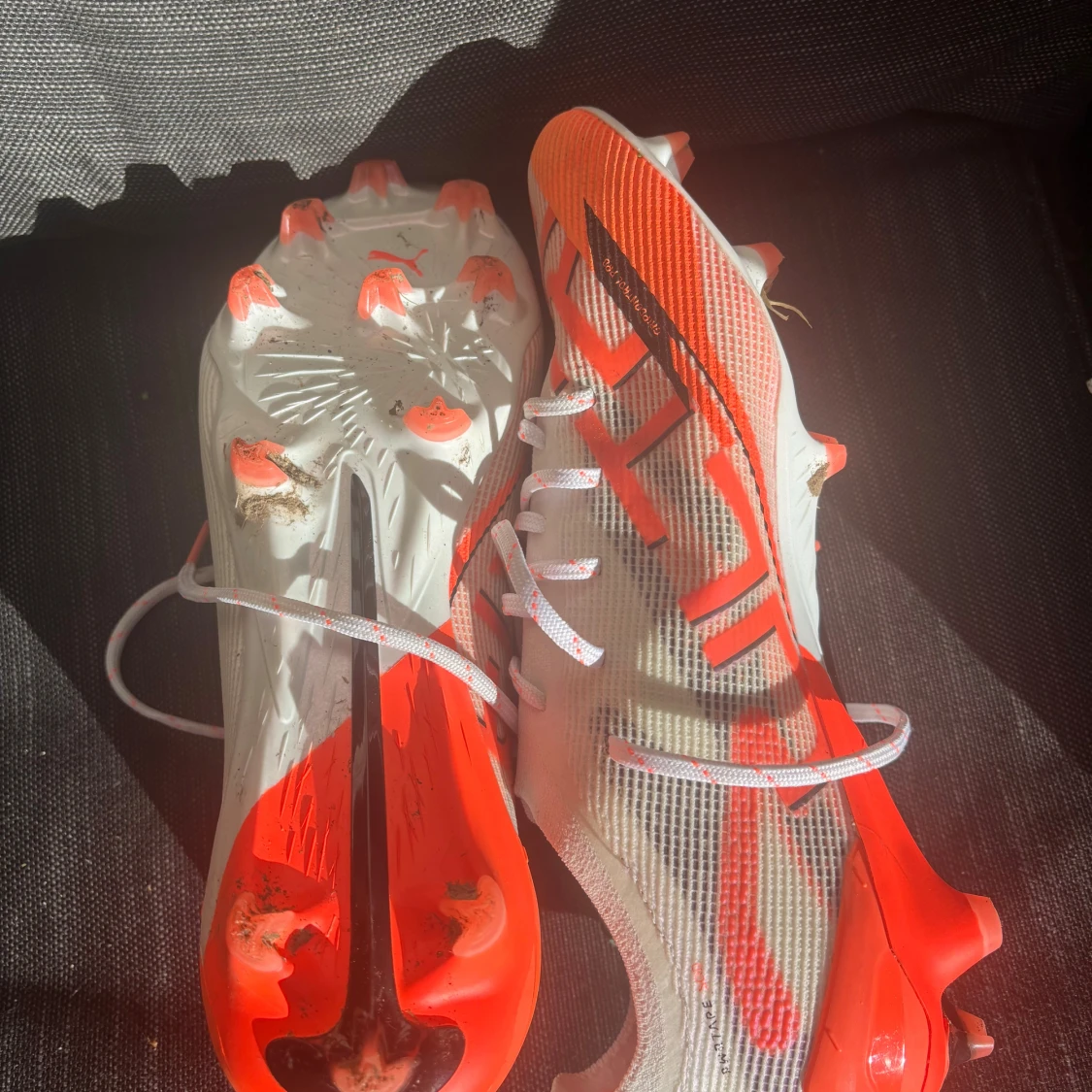 Säljer ett par snygga Puma fotbollsskor i vitt och neonorange med svarta detaljer. Skorna har snörning och en låg, strömlinjeformad siluett med platt sula och dobbar för gräsplan. Ovandelen är tillverkad i syntetmaterial med coolt grafiskt mönster och Puma-logga på sidan.
