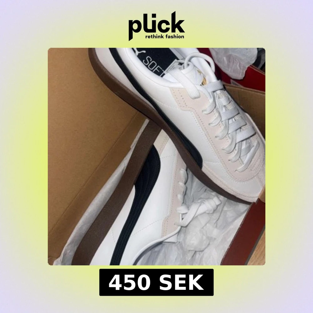 Snygga vita sneakers från Puma med svarta detaljer och brun sula. Skorna har snörning och en klassisk design som passar perfekt för vardagsbruk.
