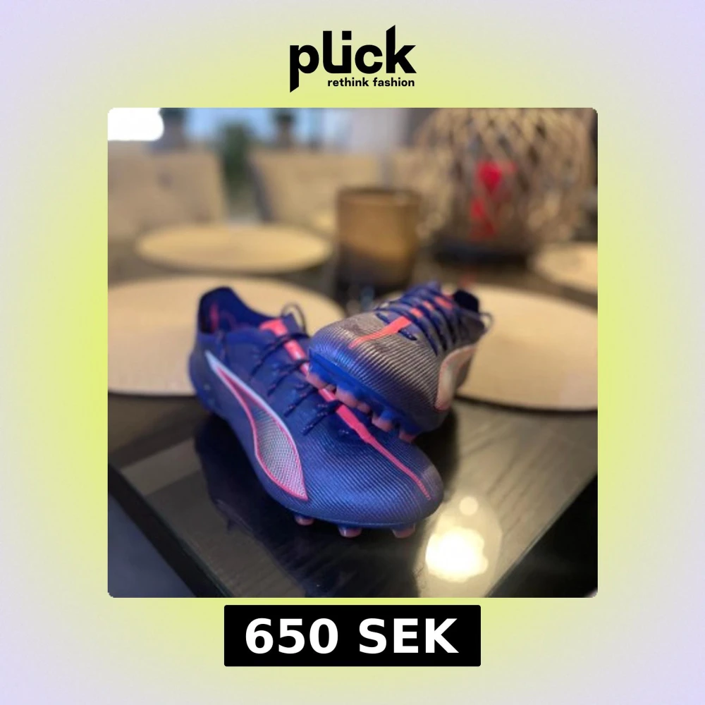 Säljer ett par blåa fotbollsskor från Puma med rosa och vita detaljer. Skorna har snörning och är designade för att ge bra grepp på planen med sina dobbar. Perfekta för dig som vill sticka ut på fotbollsplanen!