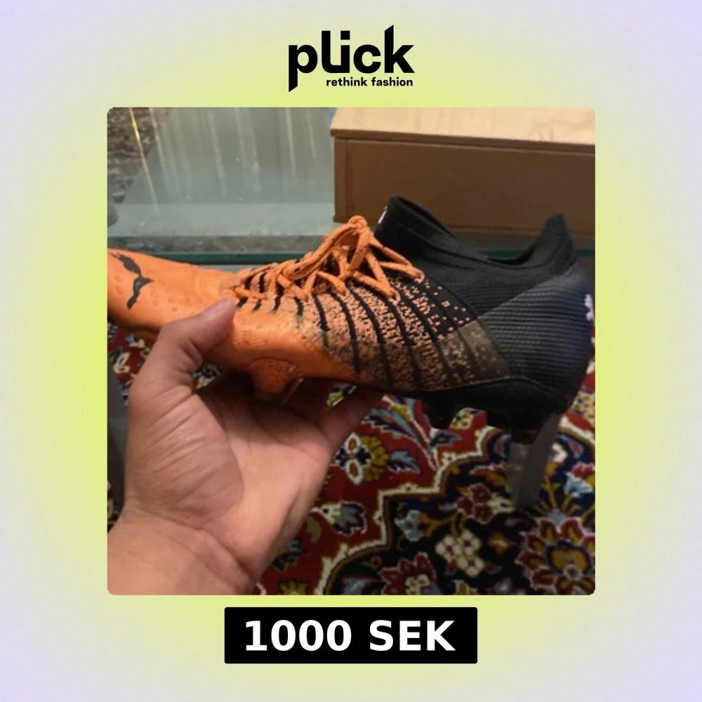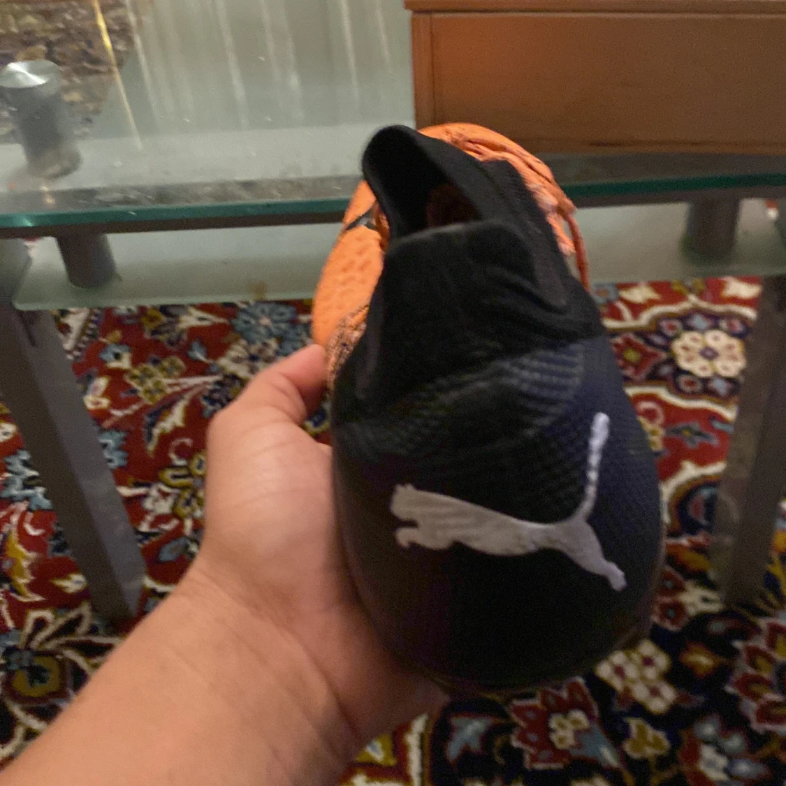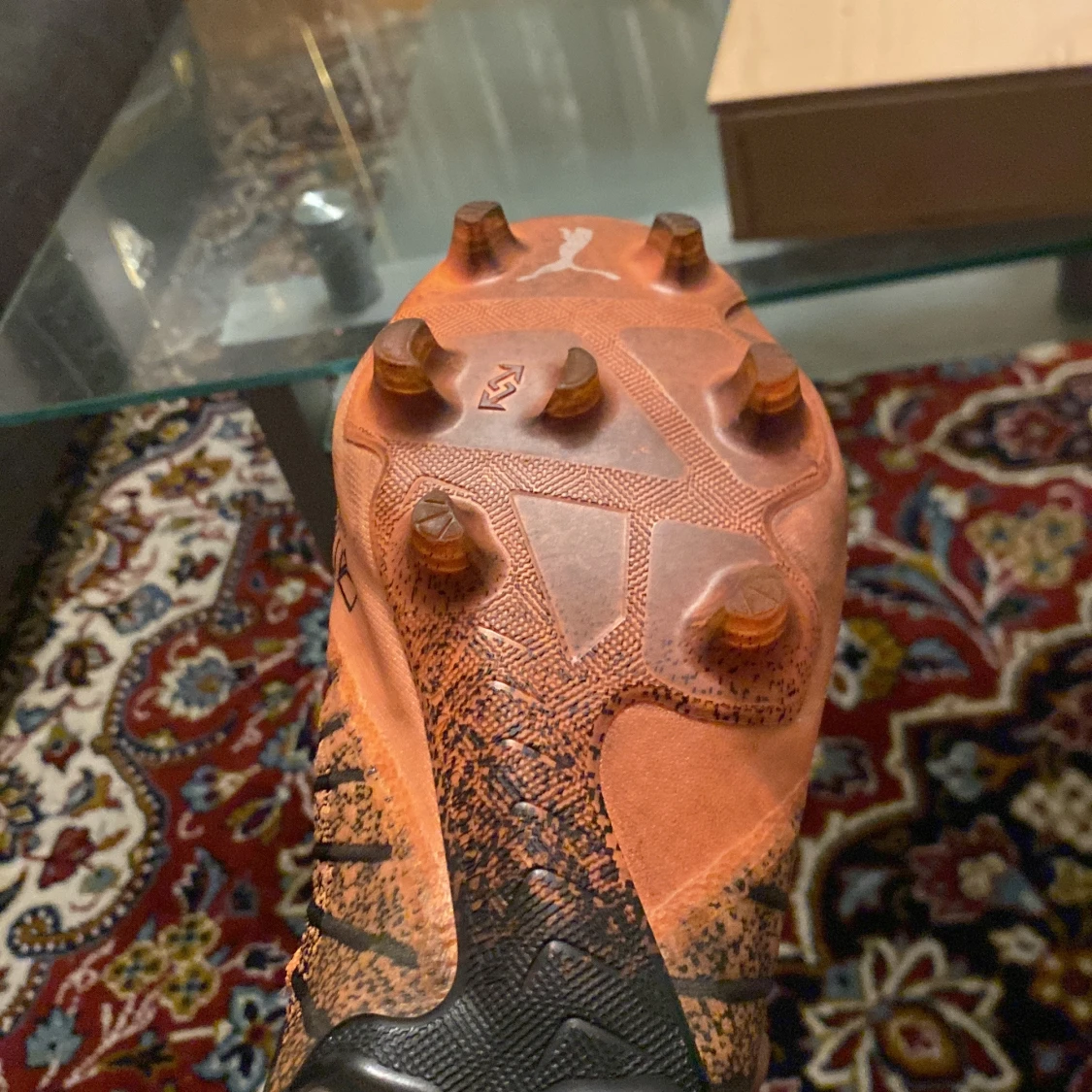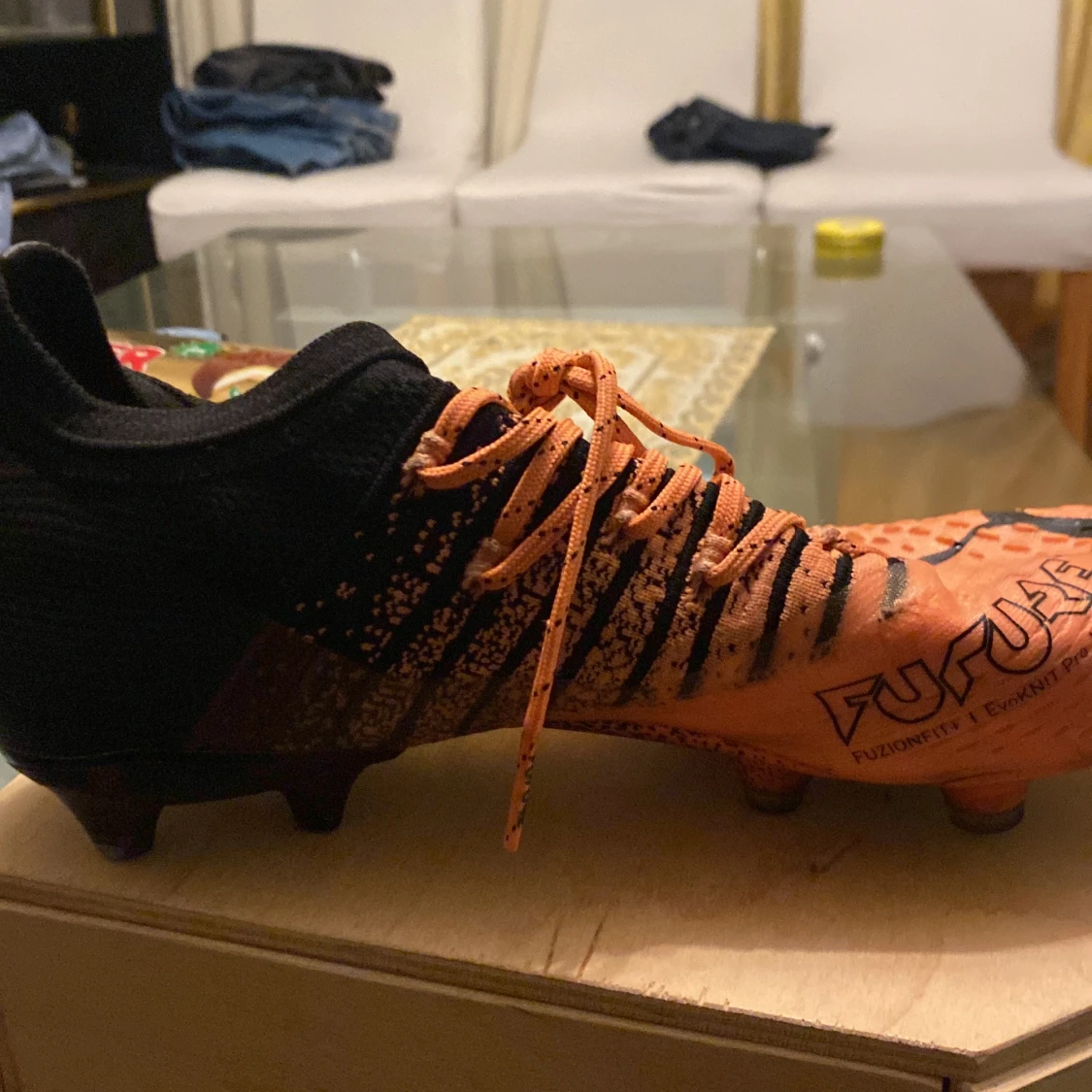 Säljer ett par coola fotbollsskor från Puma i orange och svart. Skorna har snörning och en mönstrad design med dobbar för bra grepp på planen. Perfekta för fotboll, de är använda ett par gånger bara och är på top sick.