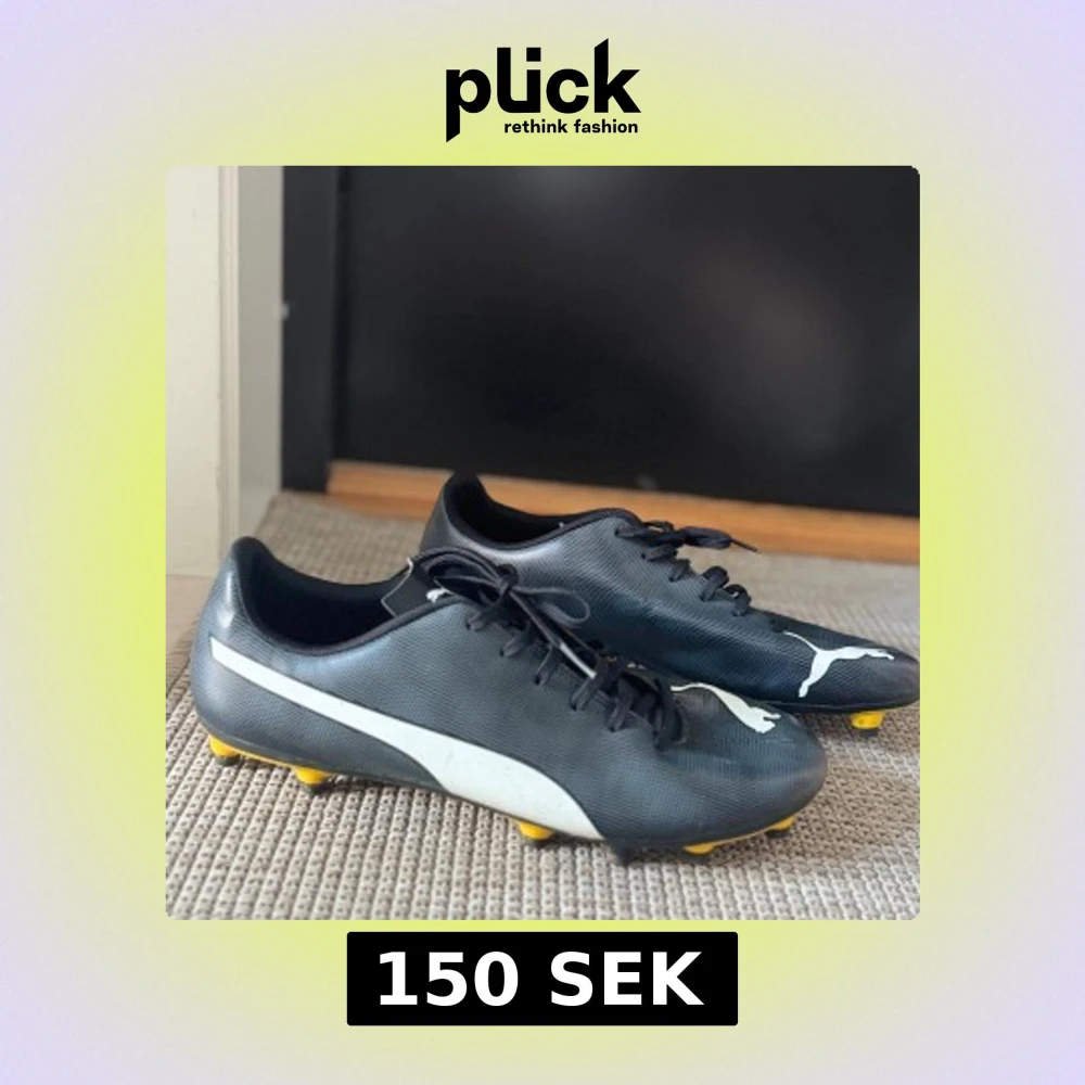 Svarta fotbollsskor från Puma med vit logga på sidan och framtill. Skorna har snörning och gula dobbar. Använda en gång.
