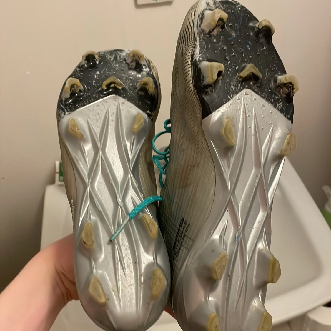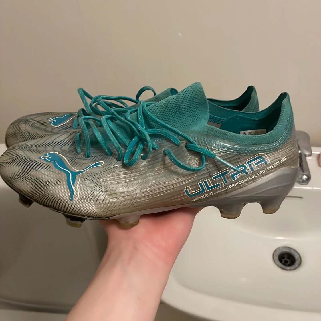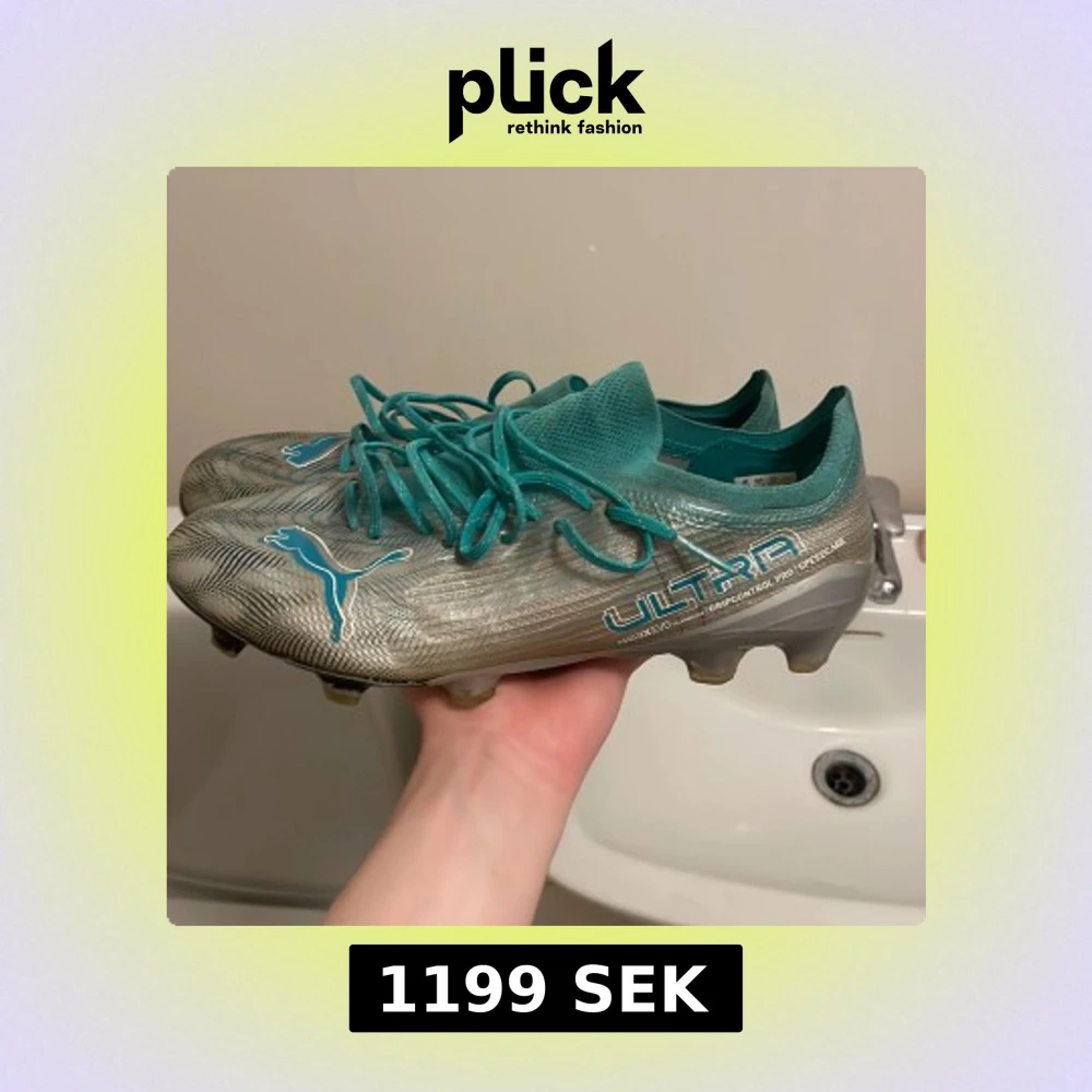 Säljer ett par Puma Ultra fotbollsskor i silver med turkosa detaljer och snörning. Skorna har rund tå, platt sula med dobbar och är designade för maximal fart på planen. Perfekta för dig som vill sticka ut med stil och prestanda.