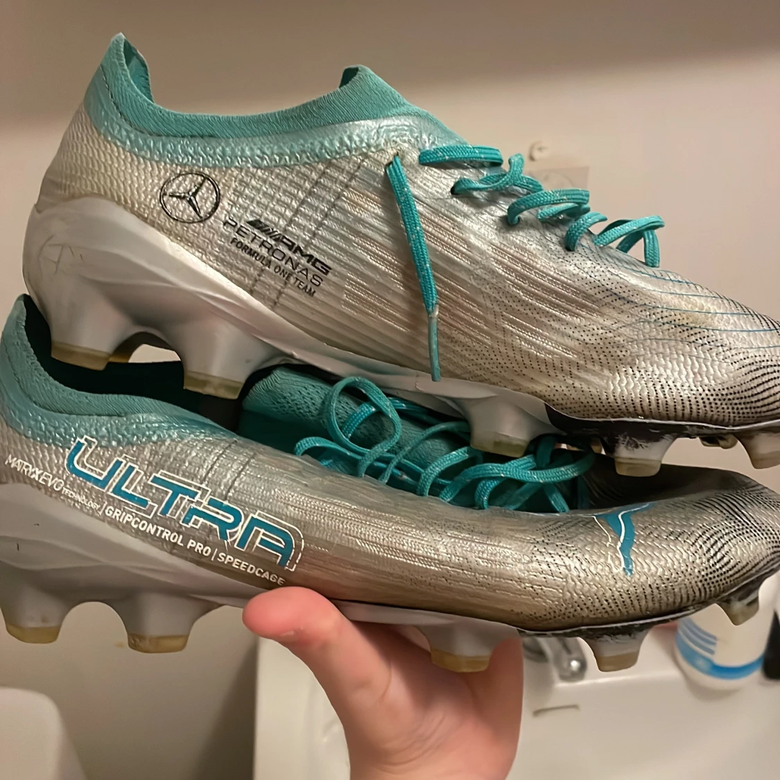 Limited edition Puma Ultra Collab med Mercedesfotbollsskor i silver och turkos