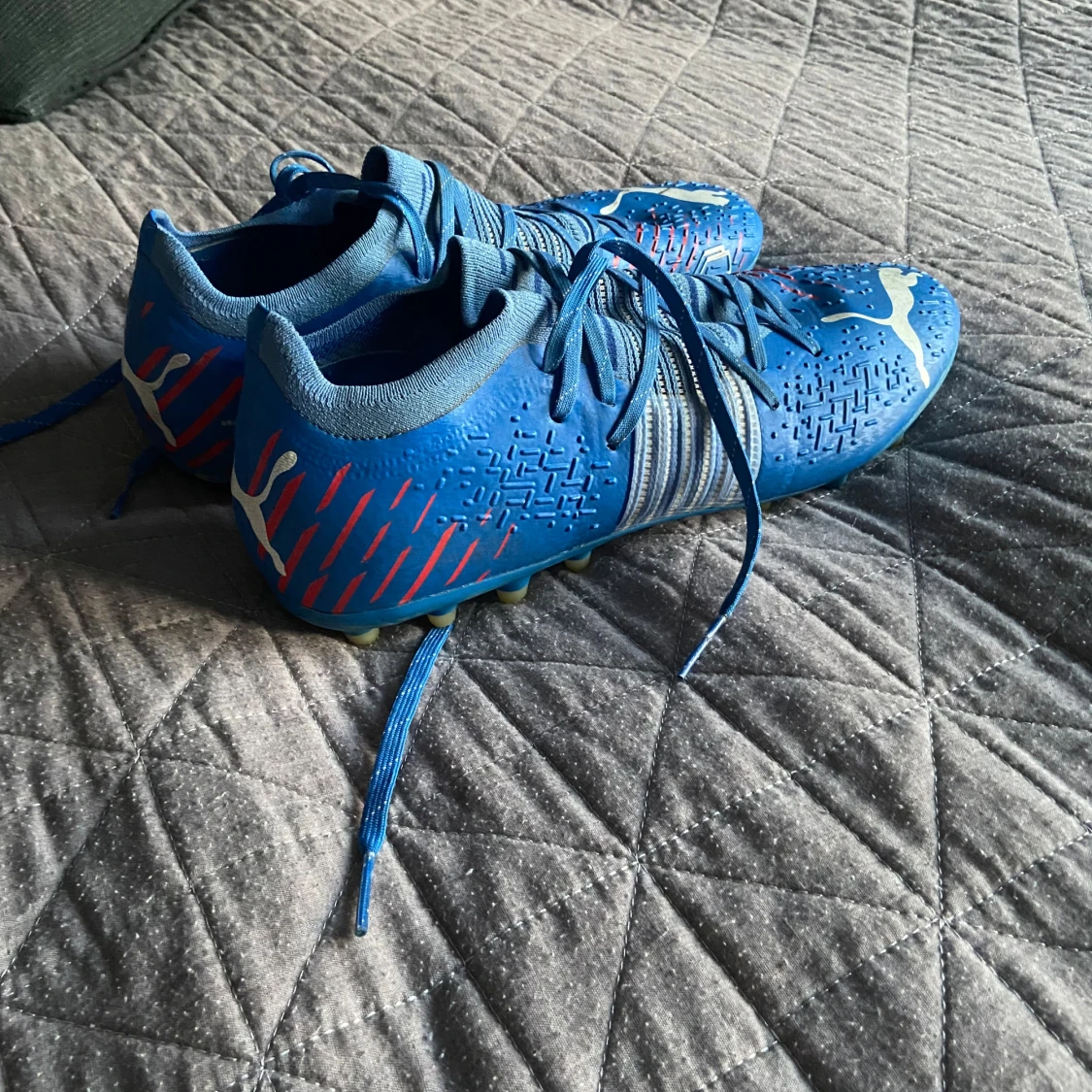 Säljer ett par blåa fotbollsskor från Puma med vita detaljer och snörning. Skorna har rund tå och platt sula med fasta dobbar, perfekta för spel på gräsplan och konstgräs. Snygg design med mönster och logga på sidan. Skorna är i storlek men lite små i storleken