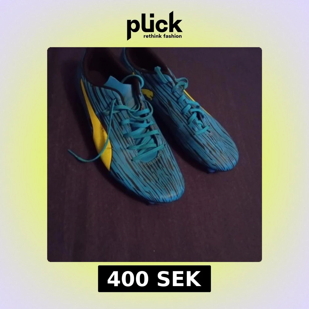 Säljer ett par snygga blå fotbollsskor från Puma i storlek 45. Skorna har coolt randigt mönster i svart och blått, gula detaljer och klassisk Puma-logga. Utrustade med dobbar för gräsplan och snörning för bra passform. Perfekta för dig som vill sticka ut på planen.