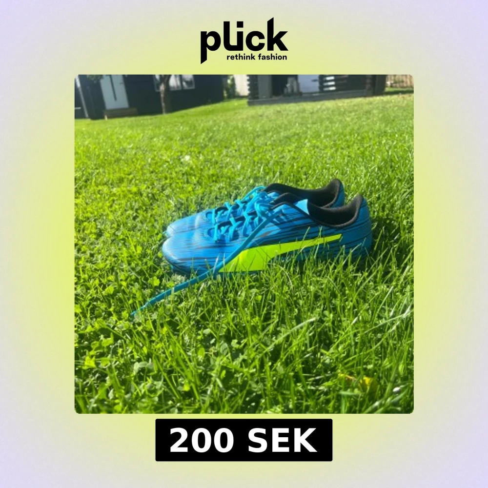 Säljer ett par snygga blåa fotbollsskor från Puma i storlek 45. Skorna har coolt svart mönster, neongul detalj på sidan och svarta innersulor. De har snörning och är tillverkade i syntetmaterial, perfekta för dig som vill sticka ut på planen.