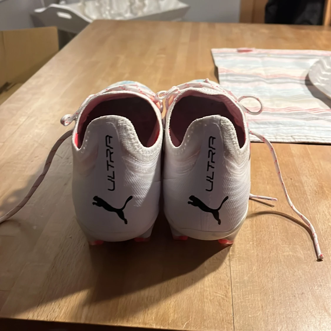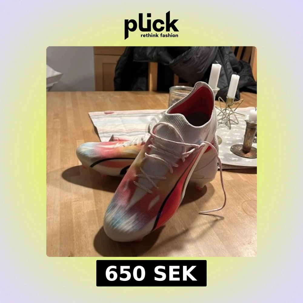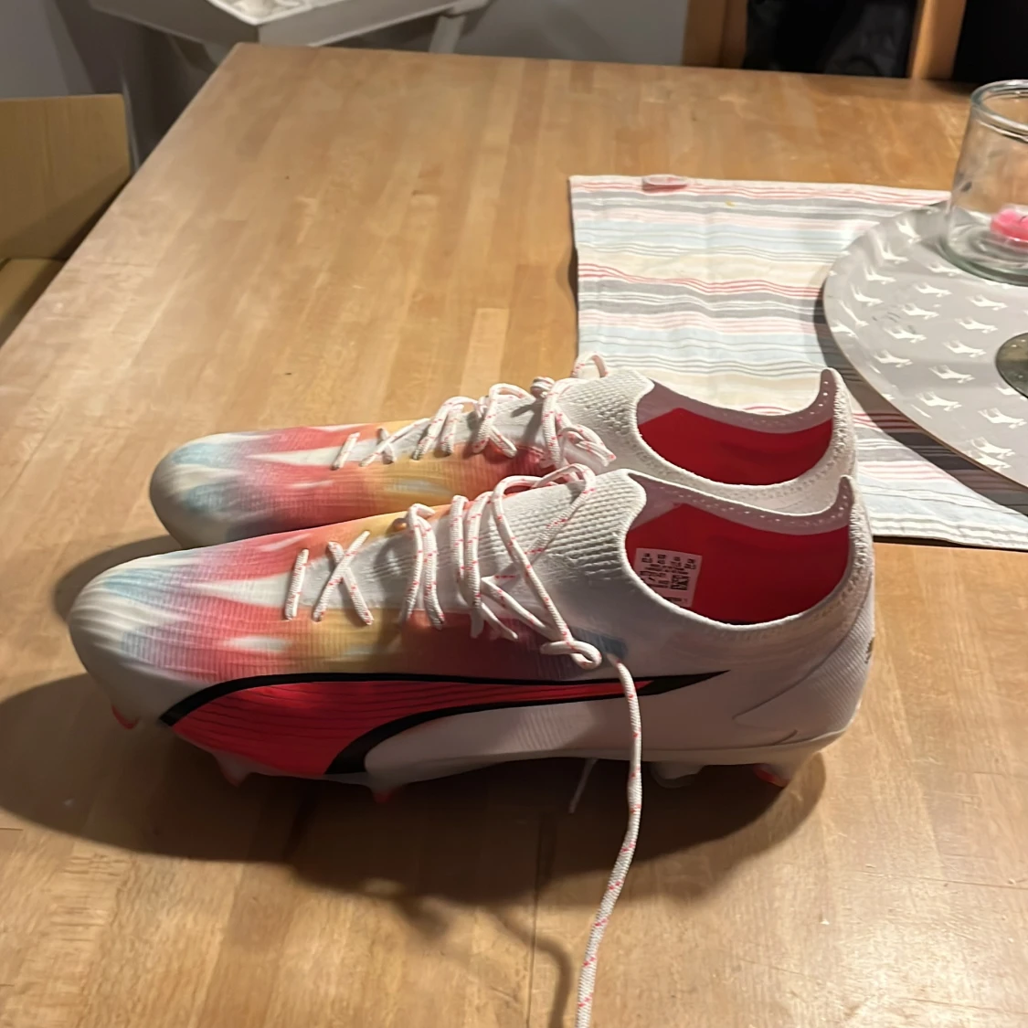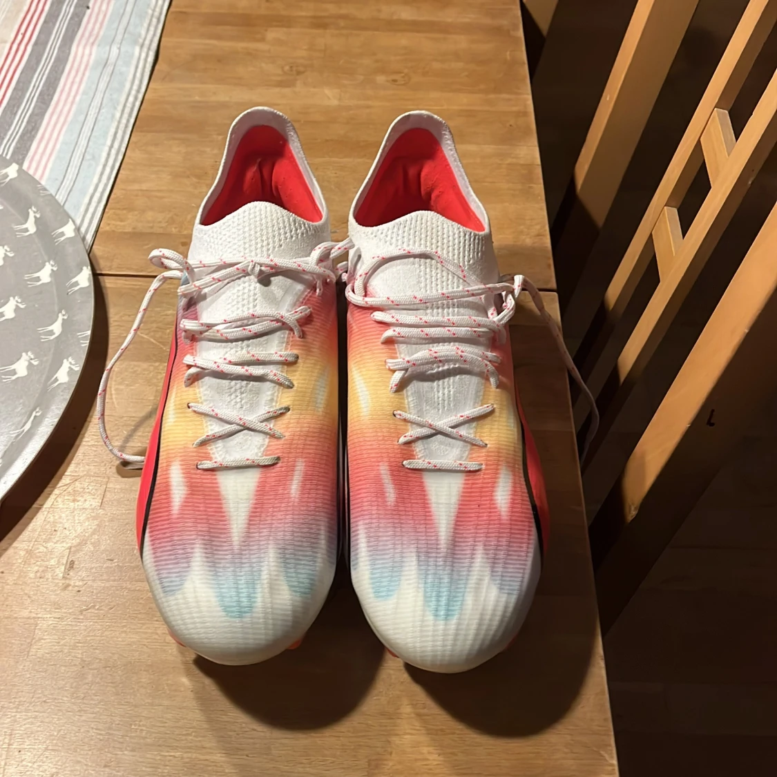 Säljer ett par färgglada fotbollsskor från Puma med en mix av rött, blått och gult. Skorna har snörning och en strömlinjeformad design för optimal prestanda på planen. Perfekta för dig som vill sticka ut! Inte använda och stolek 45