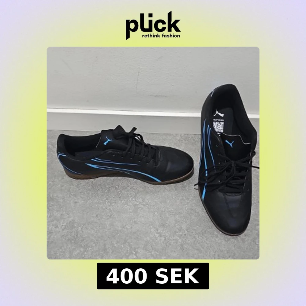 Säljer ett par svarta fotbollsskor från Puma med blå detaljer och klassisk snörning. Skorna har rund tå och platt sula, perfekt för dig som gillar att spela fotboll. Puma-loggan syns tydligt på tungan och sidan.