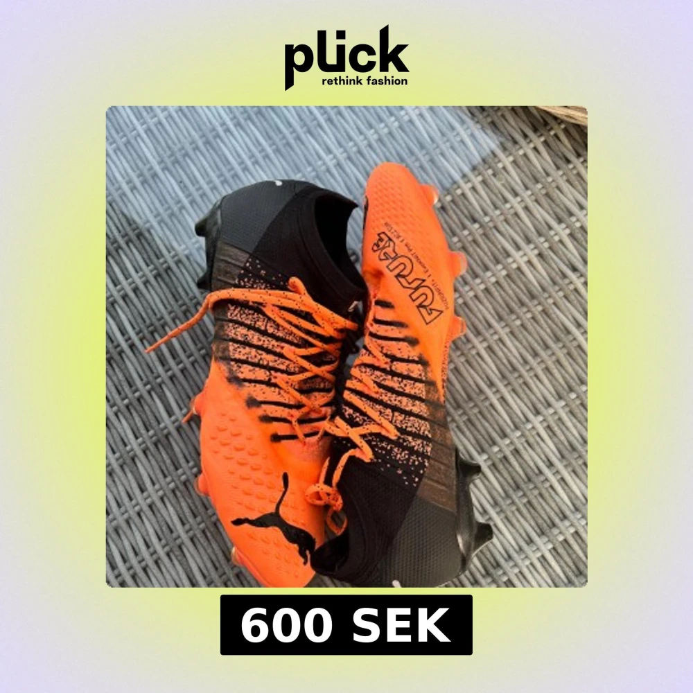 Säljer ett par grymma Puma Future fotbollsskor i orange och svart. Skorna har snörning, högre strumpliknande skaft och coolt mönster med svarta detaljer. Ovandelen är i syntetmaterial och sulan har fasta dobbar för bästa grepp på planen.