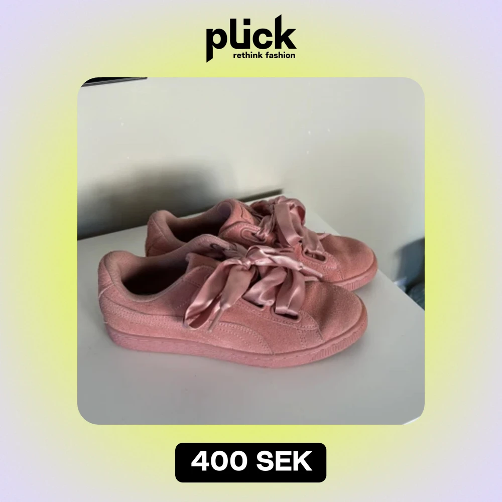 Säljer ett par snygga rosa sneakers från Puma i storlek 37. De har en unik design med breda satinband som snörning och en helrosa sula. Skorna är i bra skick och perfekta för både vardag och festliga tillfällen.