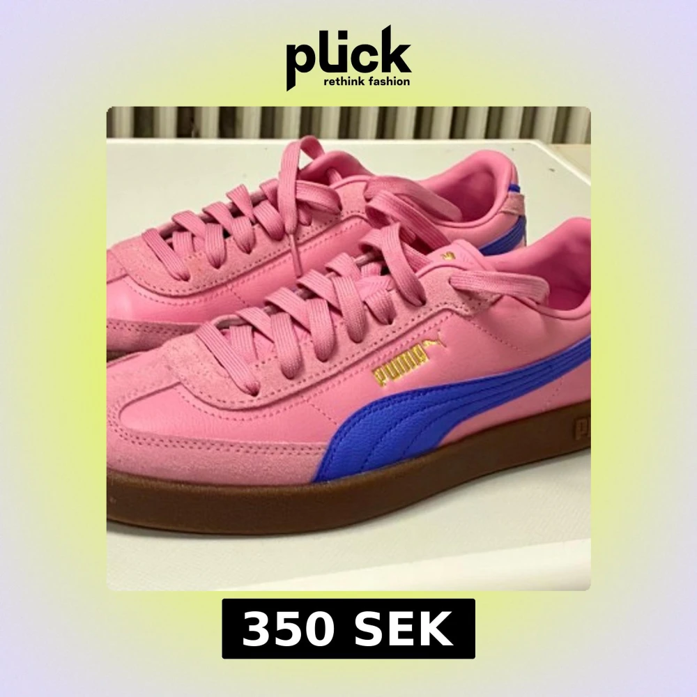 Säljer ett par Puma Club II Era sneakers i storlek 40. Skorna är ljusrosa med blå sidodetalj och guldiga Puma-loggor. Ovandelen är i skinn och mocka, med bruna gummisulor och klassisk snörning. Perfekt för dig som gillar färgstarka och unika sneakers.