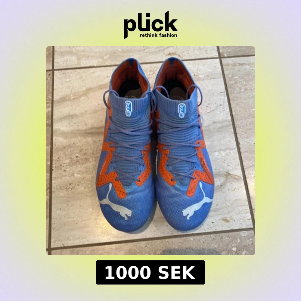Säljer ett par blå och orange fotbollsskor från Puma med snörning och en iögonfallande design. Skorna har en mönstrad yta och är perfekta för fotbollsplanen. De har en robust sula med dobbar för bra grepp. Skorna är väl omhändertagna och lite andvända. Box medföljer