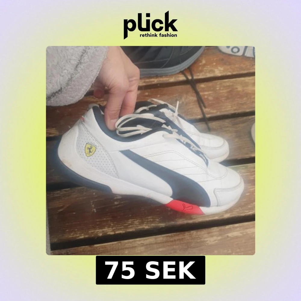 Olika skor med storlekar mella Säljer ett par vita Puma Ferrari sneakers med svarta och röda detaljer. Skorna har en sportig design med Ferrari-logga på sidan och svarta snören. Perfekta för dig som gillar motorsport och streetstyle.