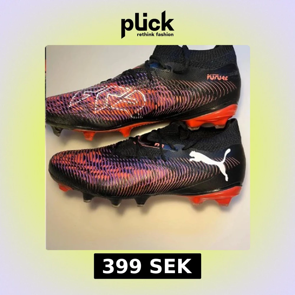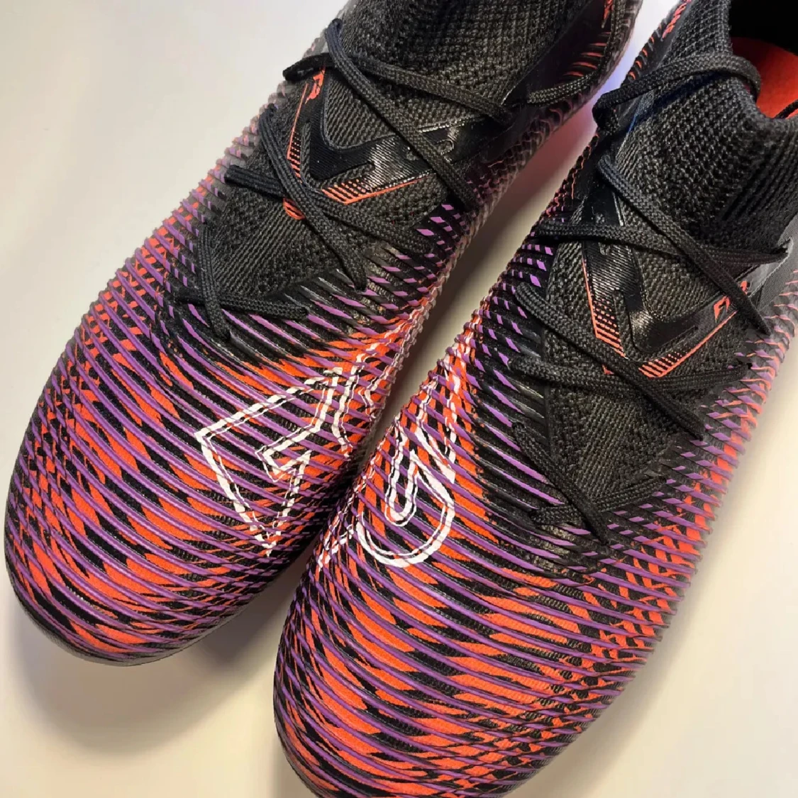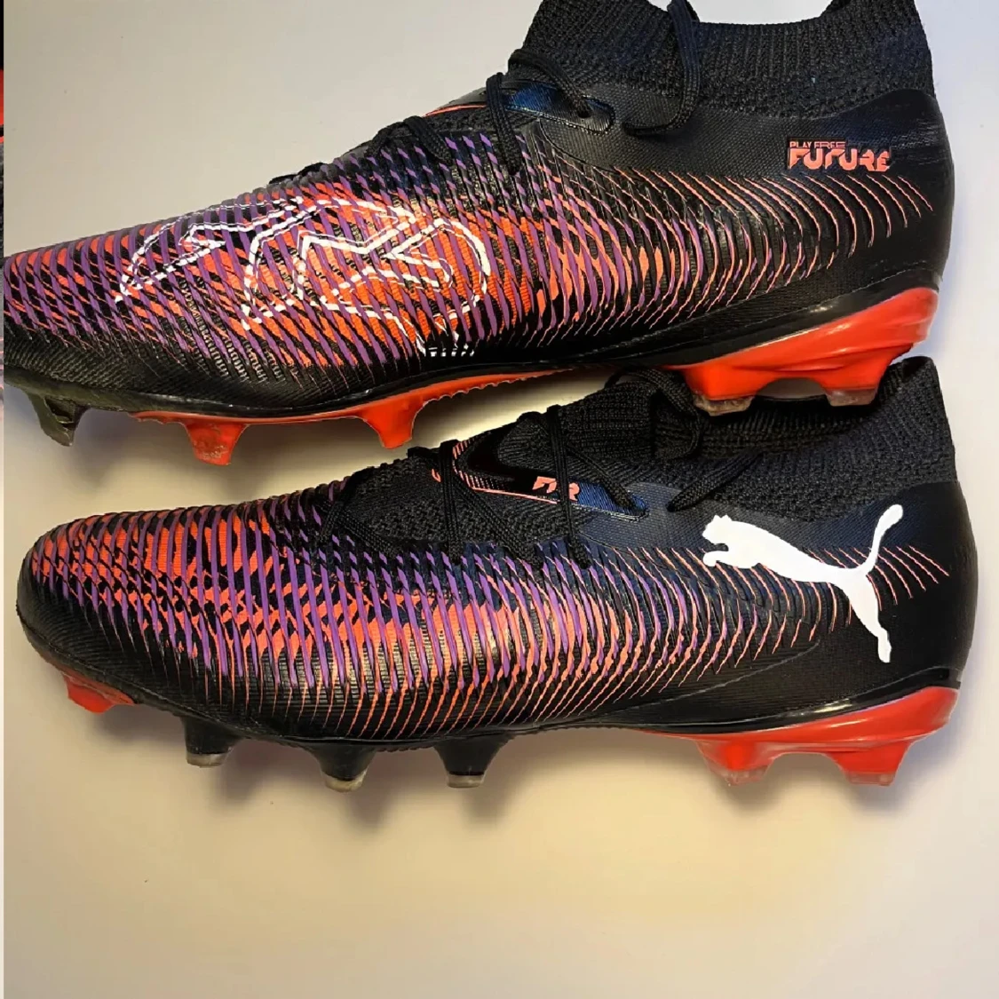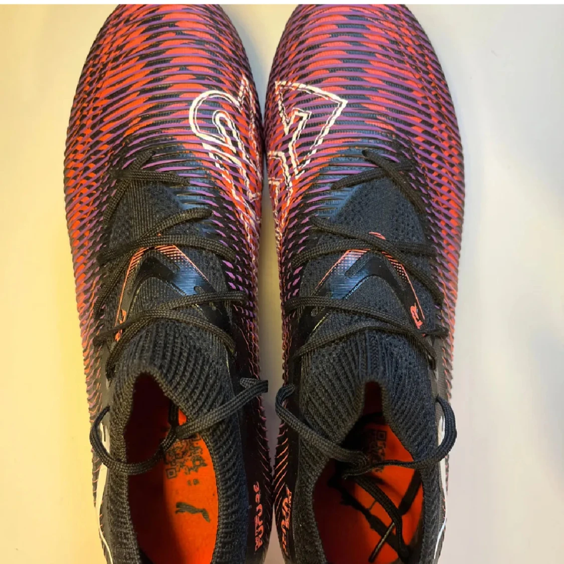 Snygga Puma Future Z fotbollsskor i svart med röda och lila detaljer. Skorna har stickad strumpliknande krage, snörning och en cool grafisk design. Yttersulan är röd och skon har Pumas logga i vitt på sidan. Perfekta för dig som vill sticka ut på planen.