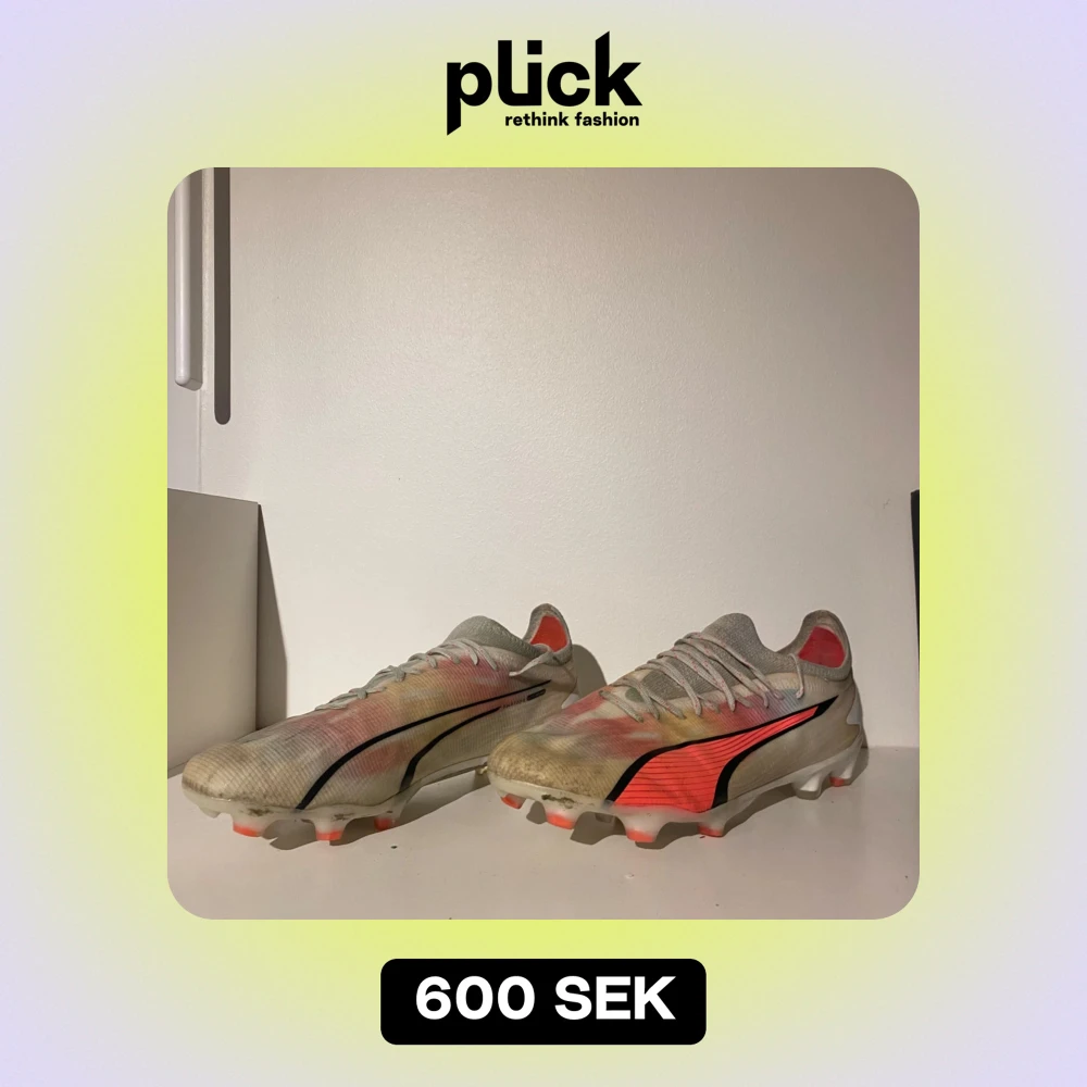 Säljer ett par fotbollsskor från Puma i bra skick. Skorna är i en vit och röd färgkombination med svarta detaljer. De har snörning och är perfekta för fotbollsträning eller match. Sulan har bra grepp och är designad för att ge stabilitet på planen. Konstgräss och normal gräs