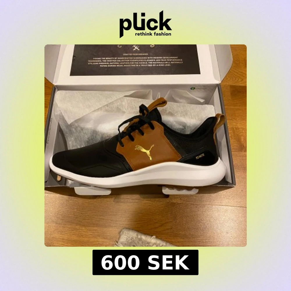 Snygga Puma Ignite NXT Crafted sneakers i svart och brunt med gulddetaljer. Skorna har en modern design med snörning och en bekväm vit sula. Perfekta för en stilren look.