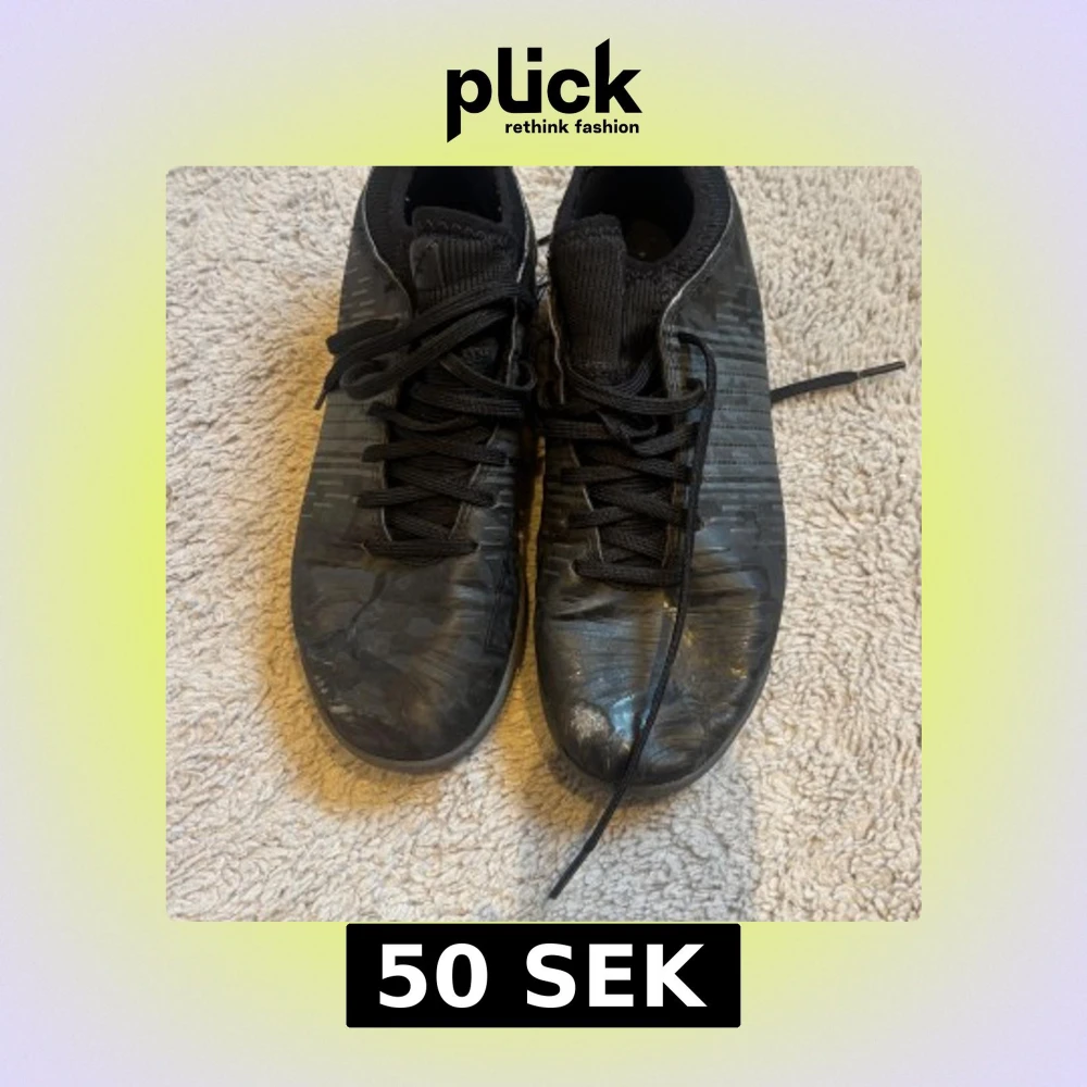 Säljer ett par svarta fotbollsskor från Puma i storlek 38. Skorna har snörning, rund tå och platt sula. De är tillverkade i syntetmaterial och har en diskret mönstrad yta. Perfekta för dig som vill ha stilrena skor på planen.