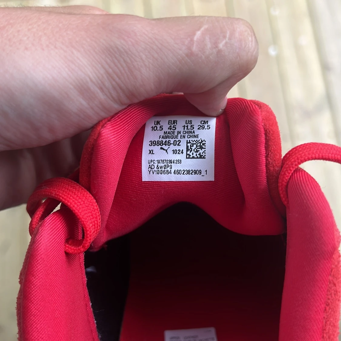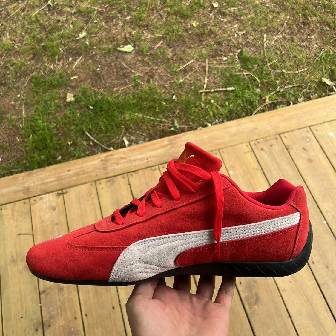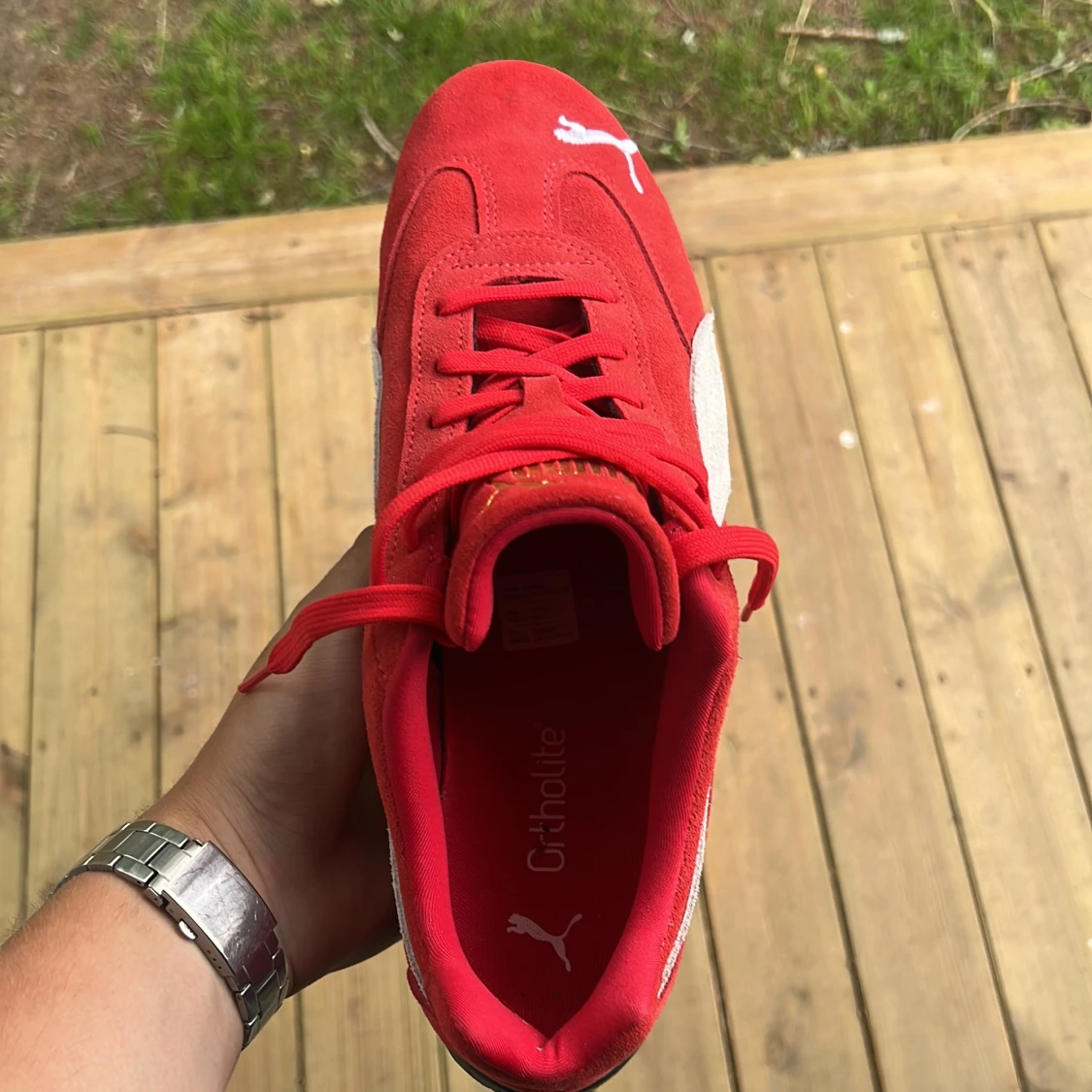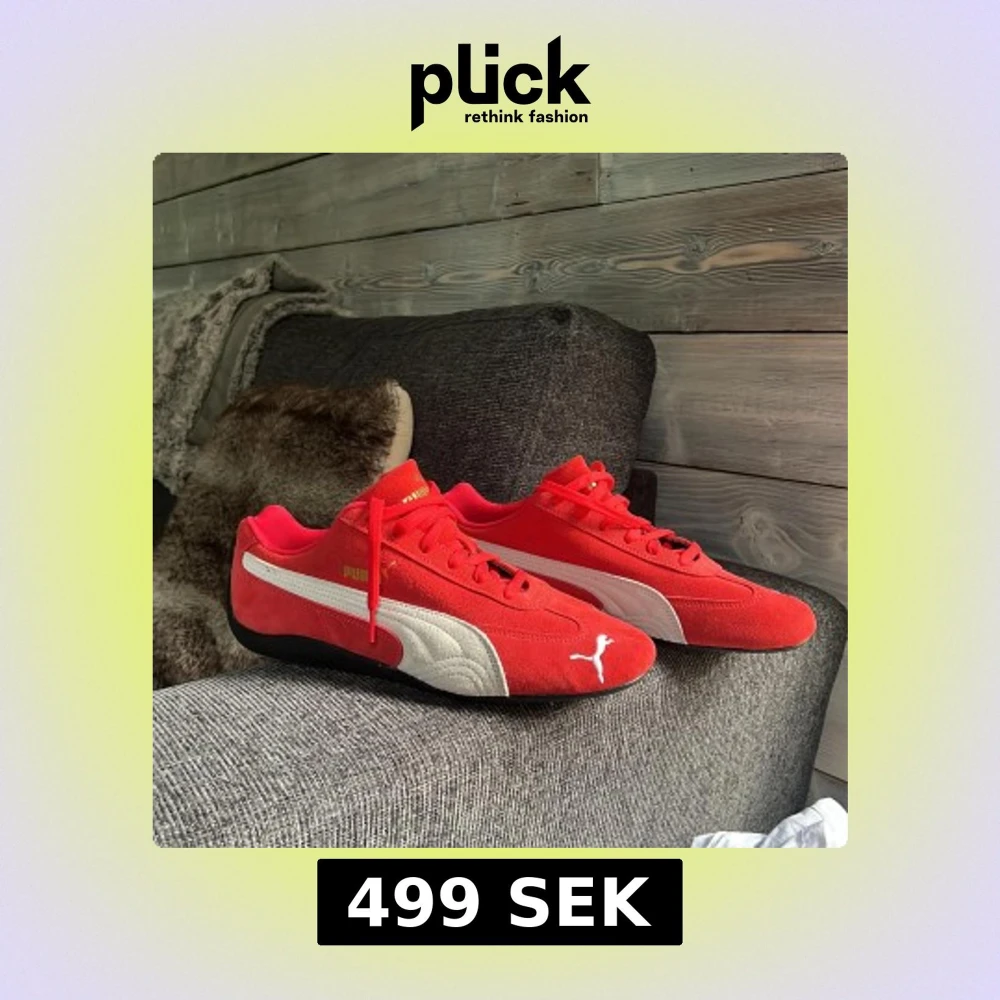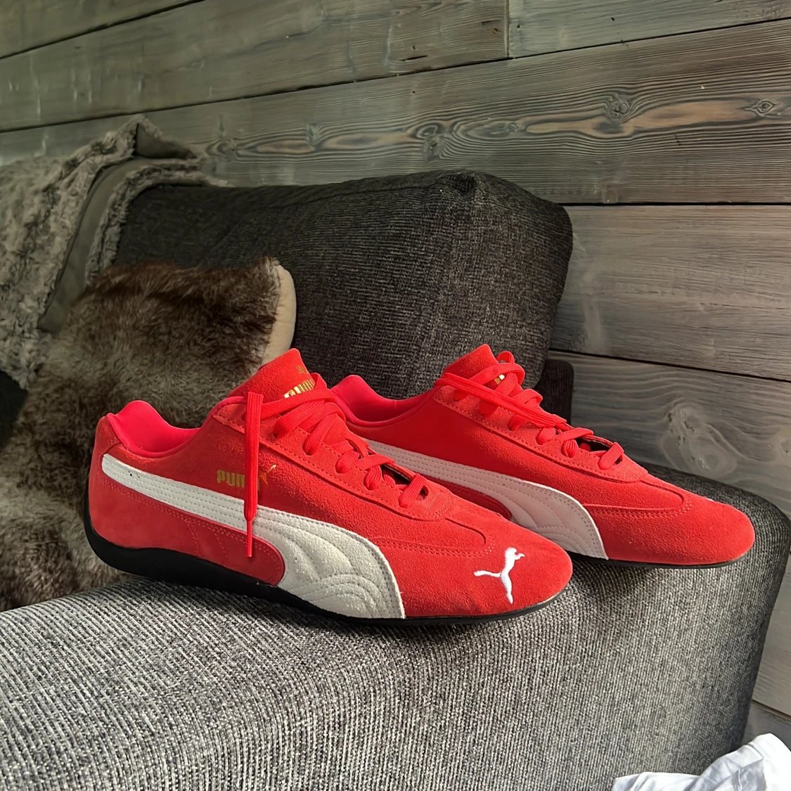Snygga röda Puma sneakers med klassisk vit formstripe på sidan och svart sula. Perfekt för dig som gillar sportig och retro stil. De är näst intill helt oanvända, haft på mig som typ en gång. Dumt spontan-köp av mig därför säljs dom.