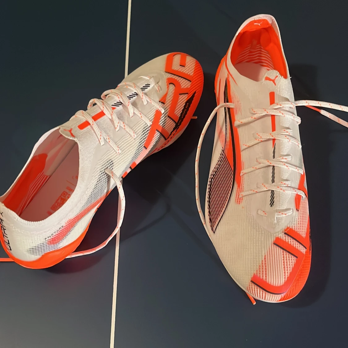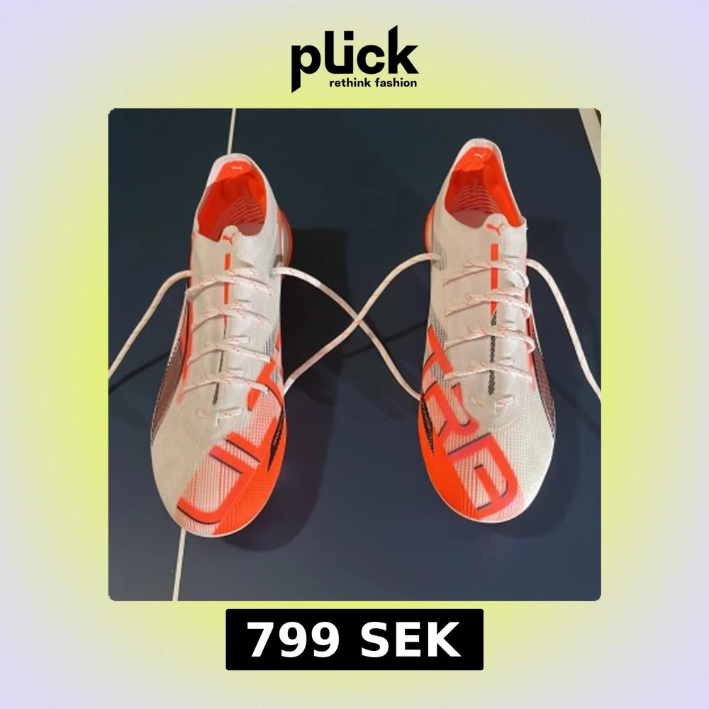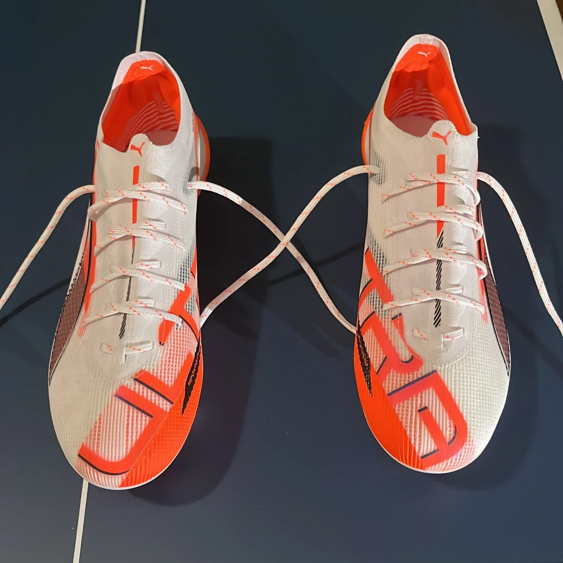 Säljer ett par Puma Ultra fotbollsskor i vitt och neonorange med svarta detaljer. Skorna har snörning, låg profil och mönstrad ovandel i syntetmaterial. Sulan har fasta dobbar för gräsplan. Snygg och modern design med ULTRA-tryck på hälen.