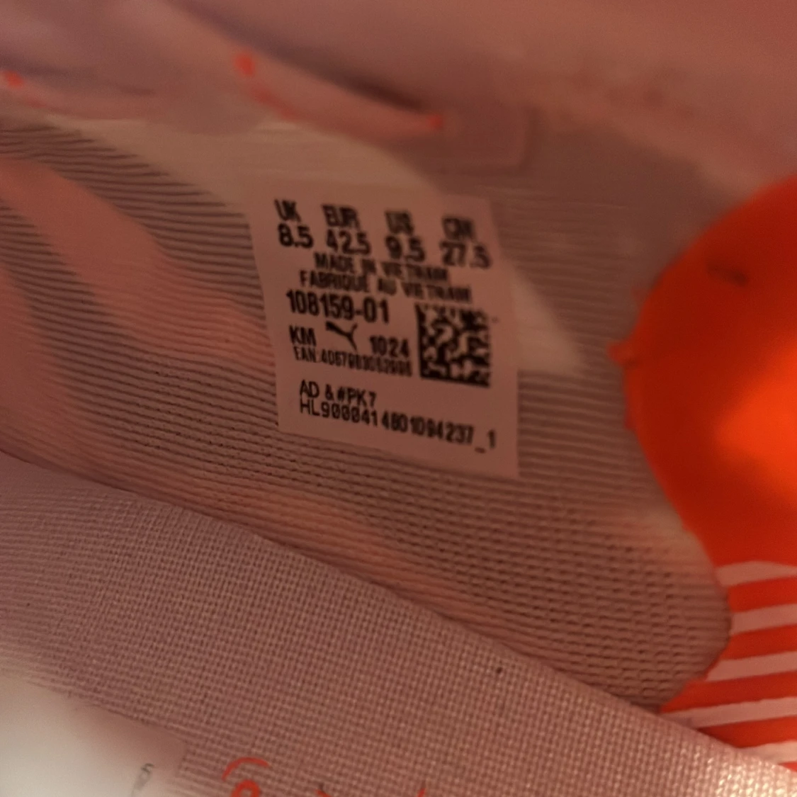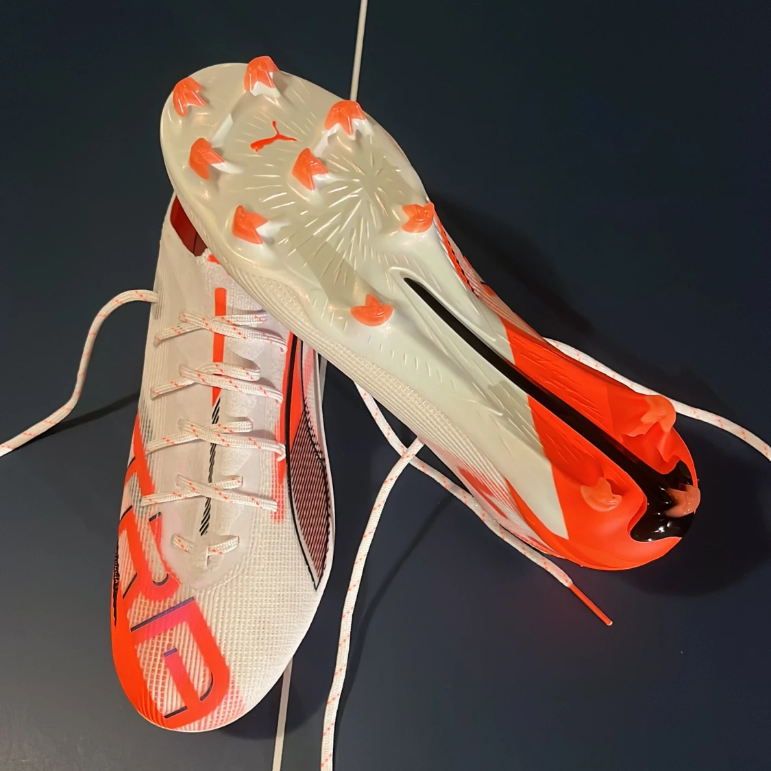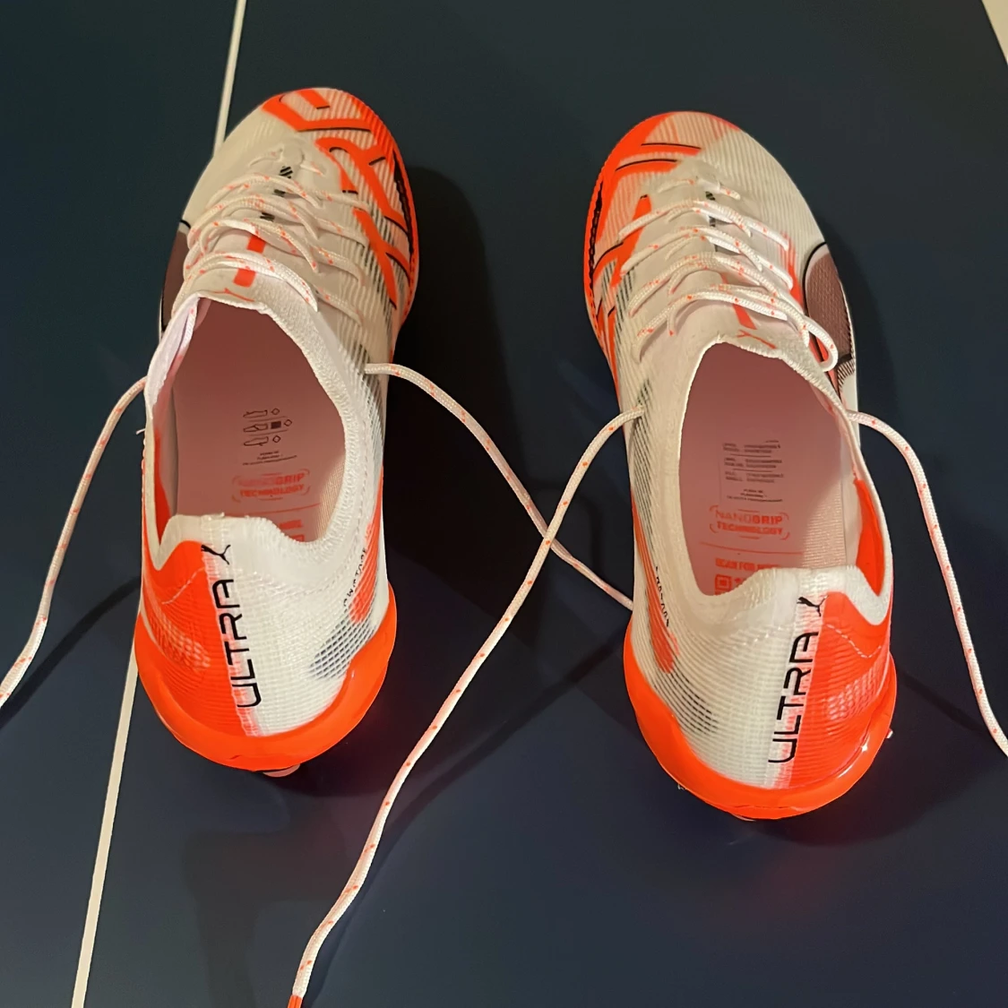 Säljer ett par Puma Ultra fotbollsskor i vitt och neonorange med svarta detaljer. Skorna har snörning, låg profil och mönstrad ovandel i syntetmaterial. Sulan har fasta dobbar för gräsplan. Snygg och modern design med ULTRA-tryck på hälen.