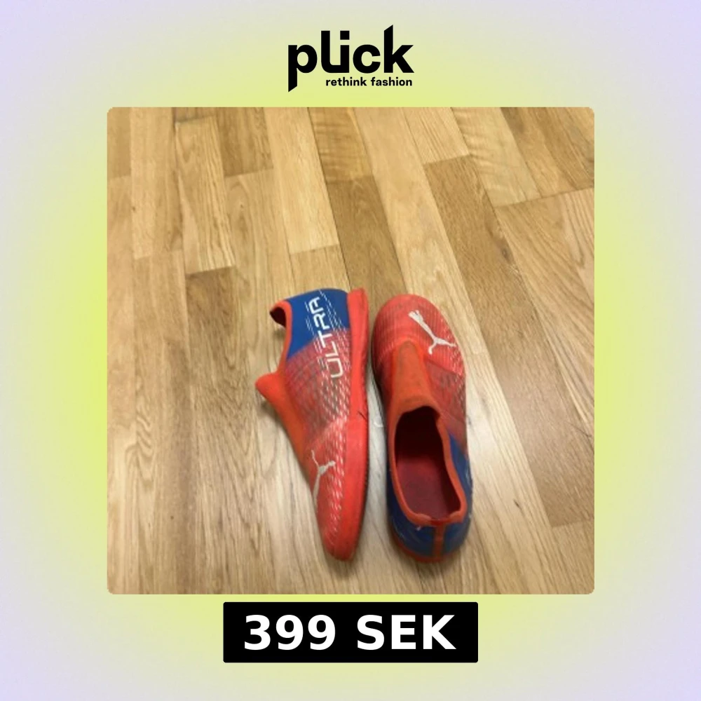 Säljer ett par Puma Ultra fotbollsskor i rött och blått med vita detaljer och logga. Skorna har en strömlinjeformad design utan snörning och är tillverkade i syntetmaterial för bästa känsla på planen. Perfekta för dig som vill sticka ut med färg och stil på matchen.