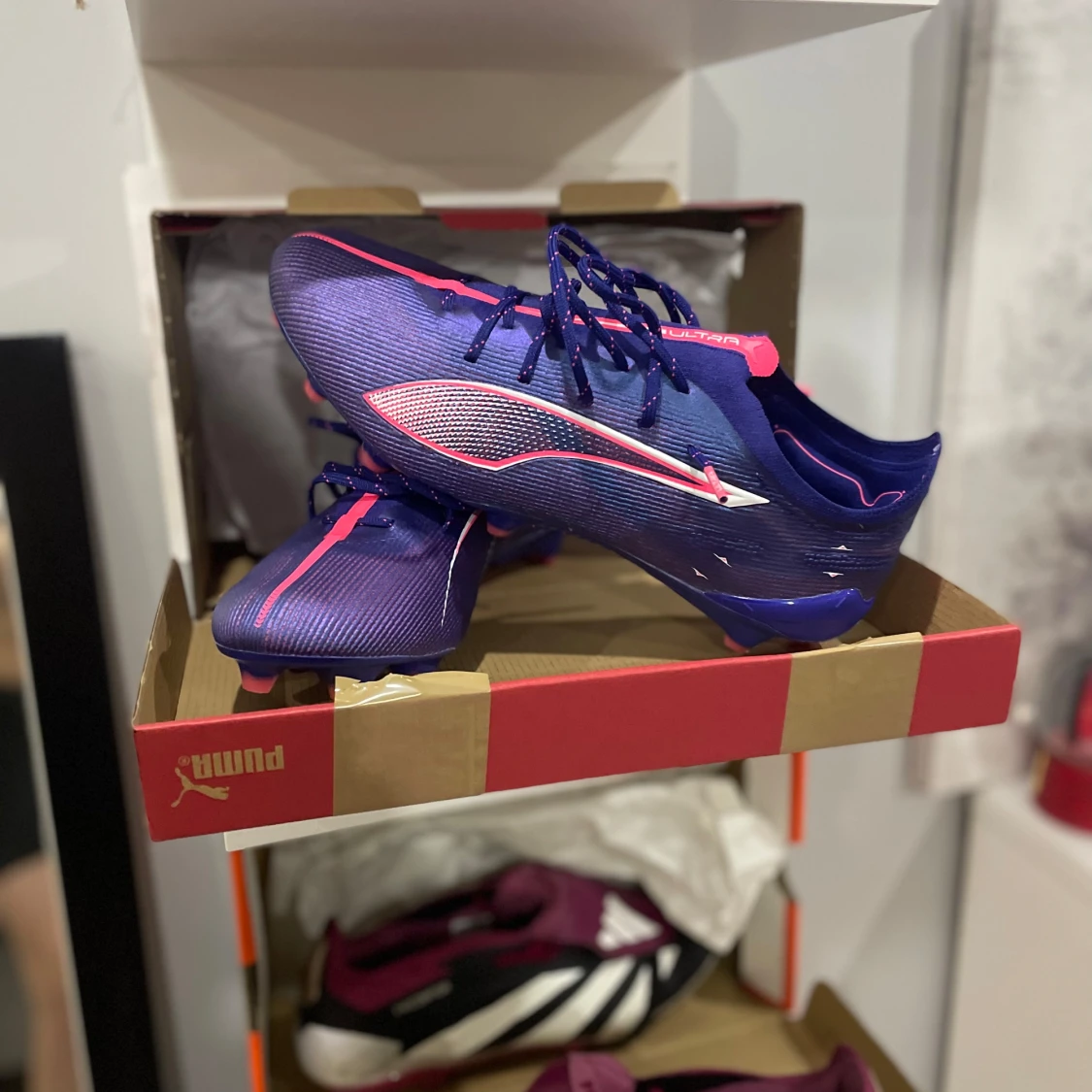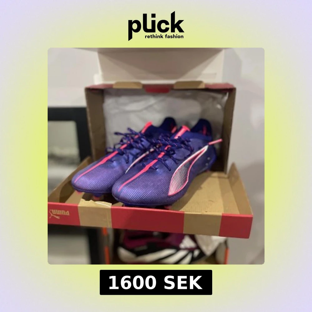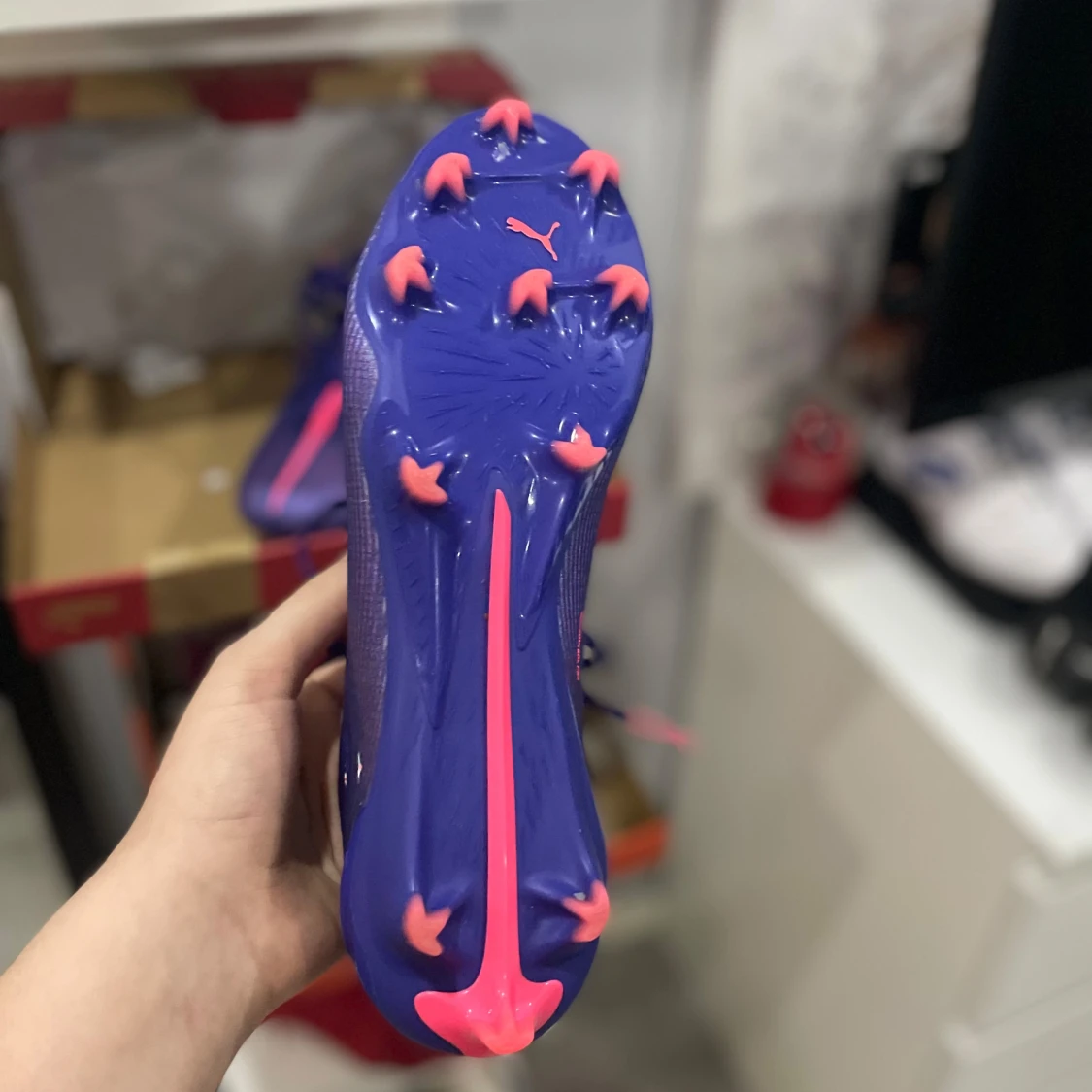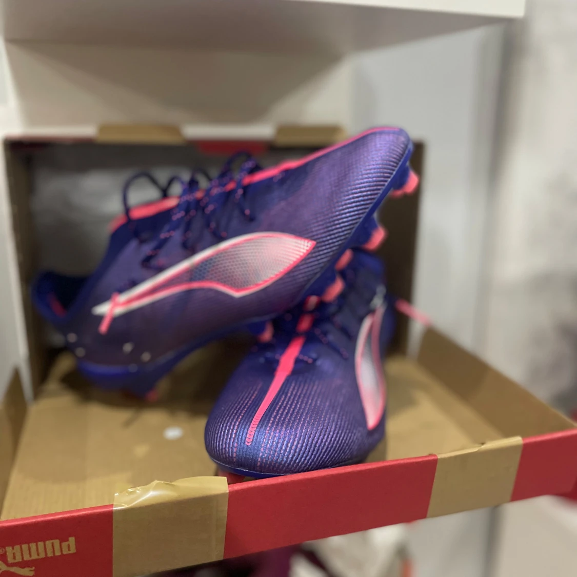 Snygga lila fotbollsskor från Puma med rosa detaljer och snörning. Skorna har en modern design med en slitstark sula och är perfekta för fotbollsplanen. De har en strömlinjeformad form för optimal prestanda.