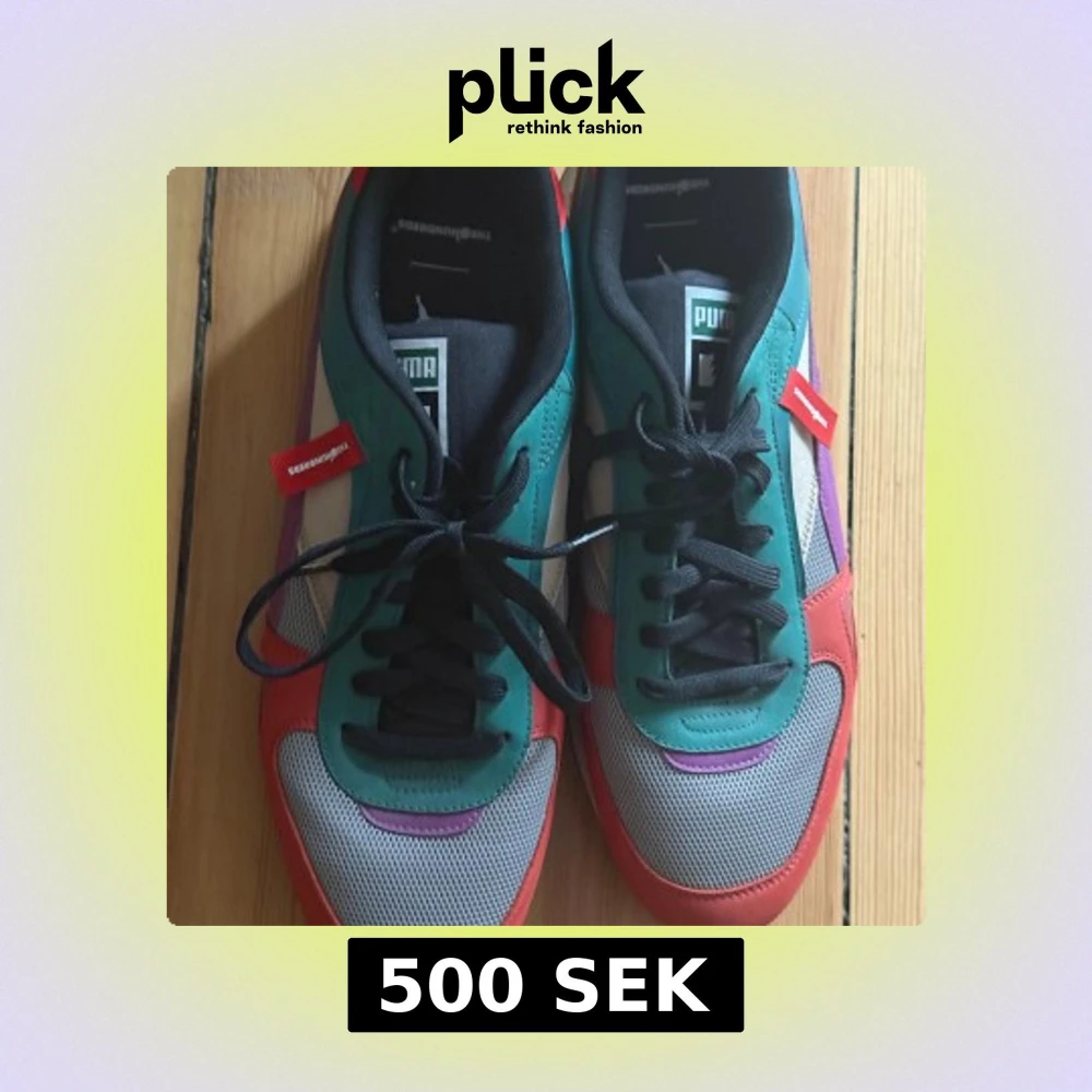 US size 14. Färgglada sneakers från Puma i samarbete med The Hundreds. Skorna har paneler i rött, grönt, lila, gult och beige med svarta detaljer och snörning. Ovandelen är i mesh och syntet med mockadetaljer och vit sula. Perfekta för dig som vill sticka ut med din stil.