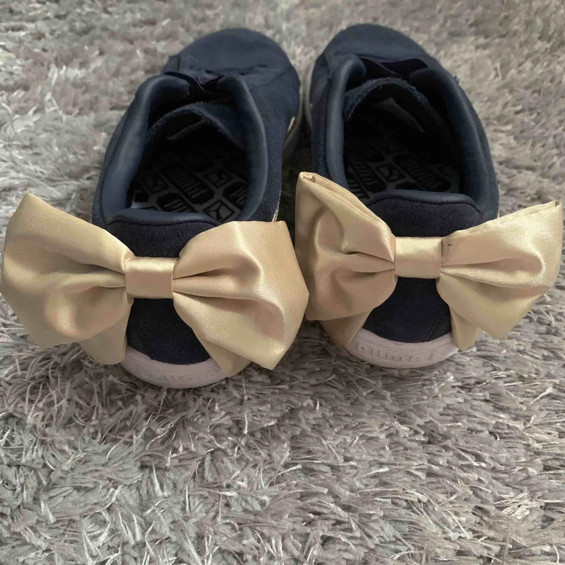 Blåa pumaskor med guld rosett på hälen, 24,5 cm innermått. Använda en gång. Köpare betalar frakt