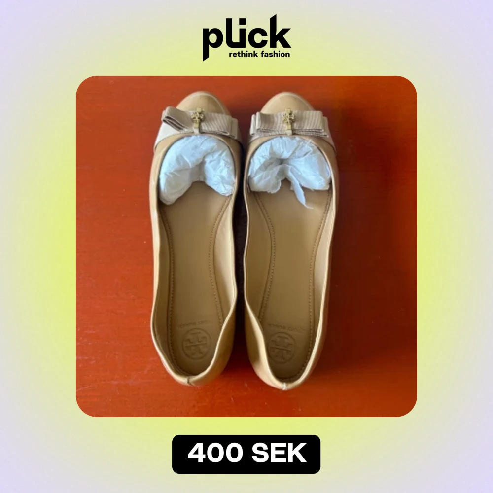 Säljer ett par snygga och eleganta beige ballerinaskor från Tory Burch. Skorna är i skinn och har en fin rosett med gulddetaljer på framsidan. Perfekta för både vardag och fest! Säljer för att jag aldrig använder dem. Som bilderna visar finns några slitningar på dem. Kartongen medföljer.