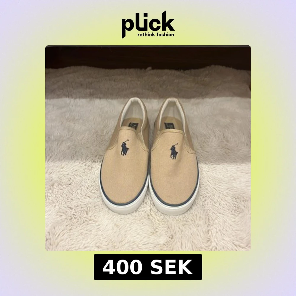 Snygga slip-on sneakers från Polo Ralph Lauren i beige canvas med klassisk mörkblå broderad logga framtill. Skorna har vit och brun gummisula med Polo-tryck baktill och en rund tå. Perfekt för dig som gillar stilren och enkel design.