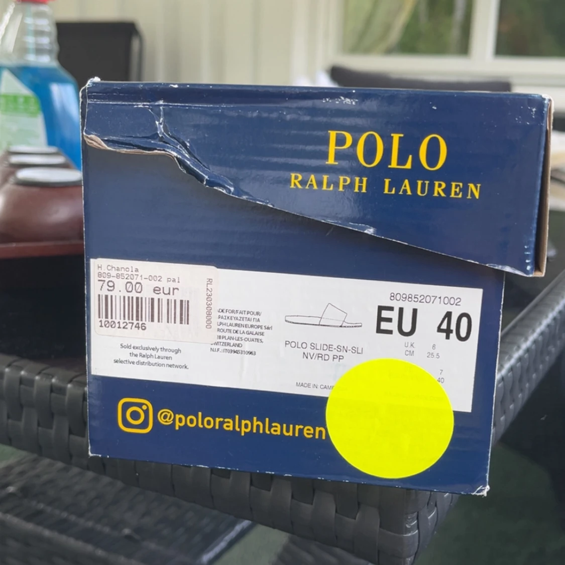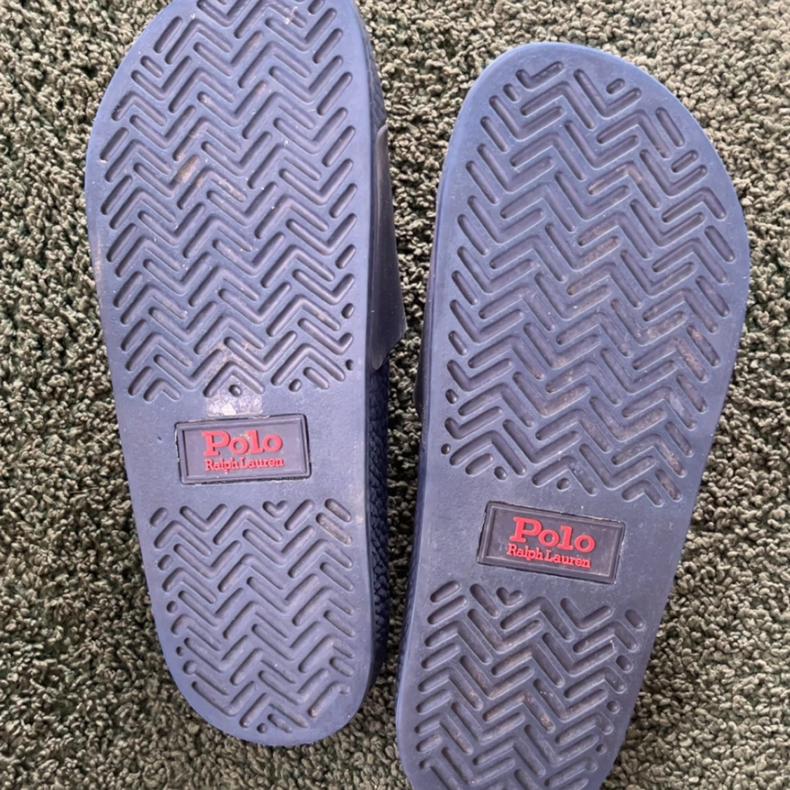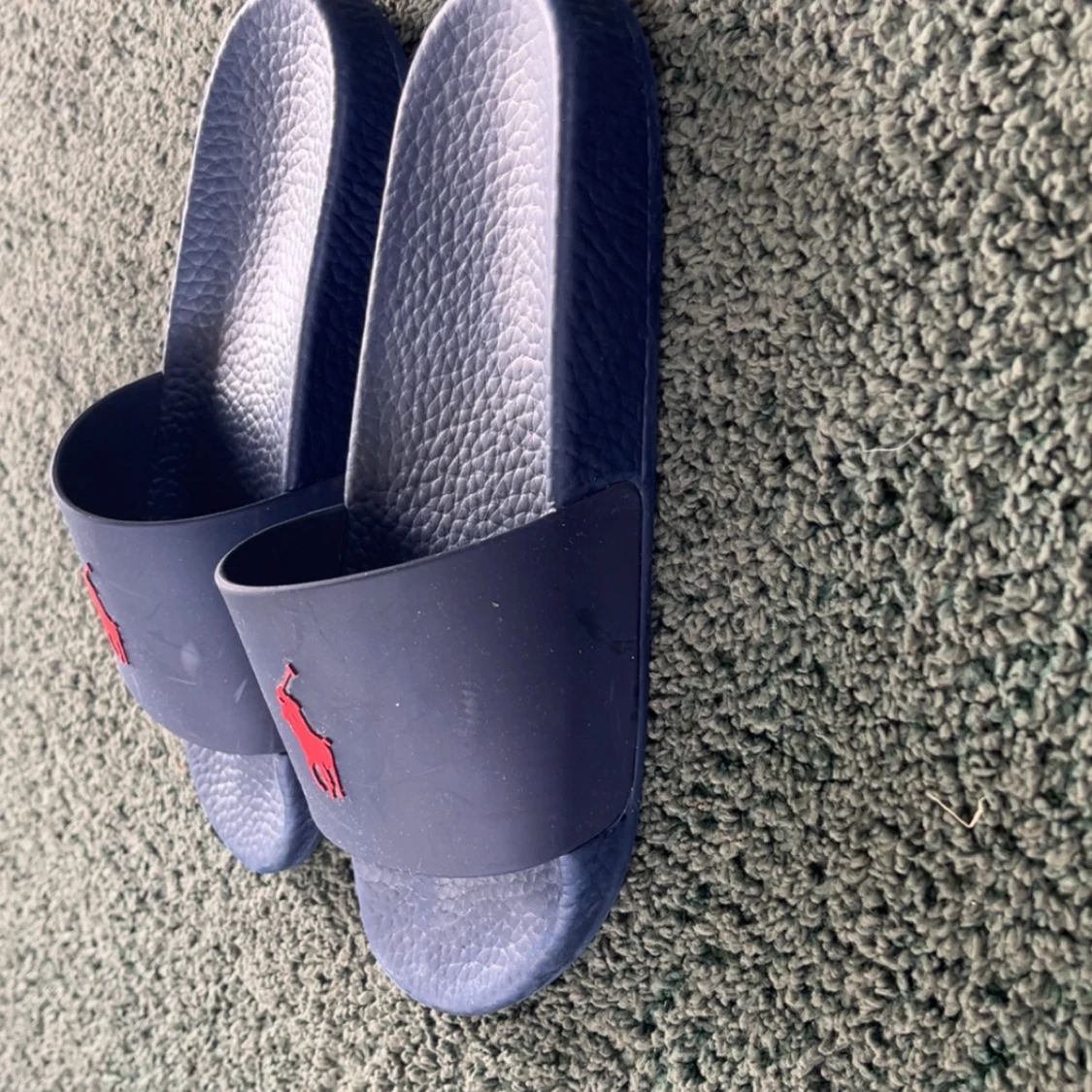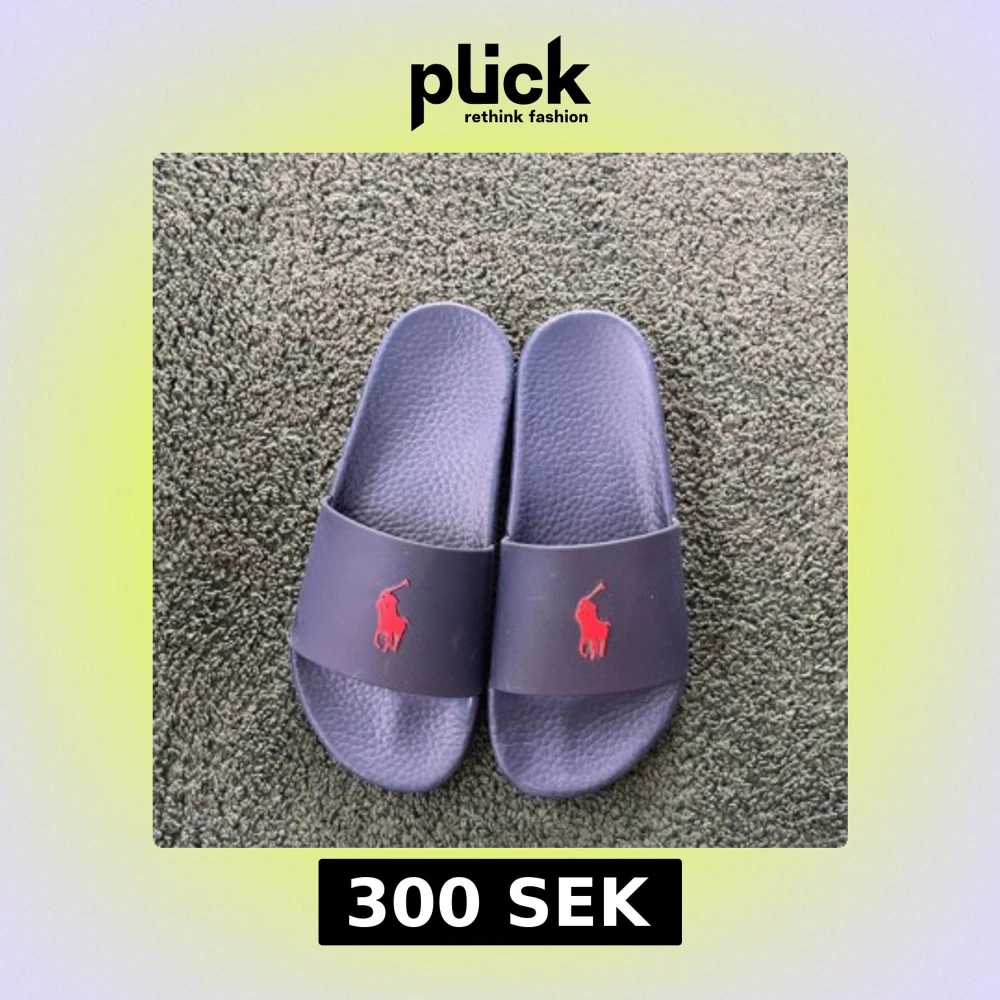 Mörkblå slides från Polo Ralph Lauren med röd logga på ovandelen. Skorna har en öppen tå och är gjorda i syntetmaterial med räfflad sula för extra grepp. Perfekta för sommaren och chill dagar.