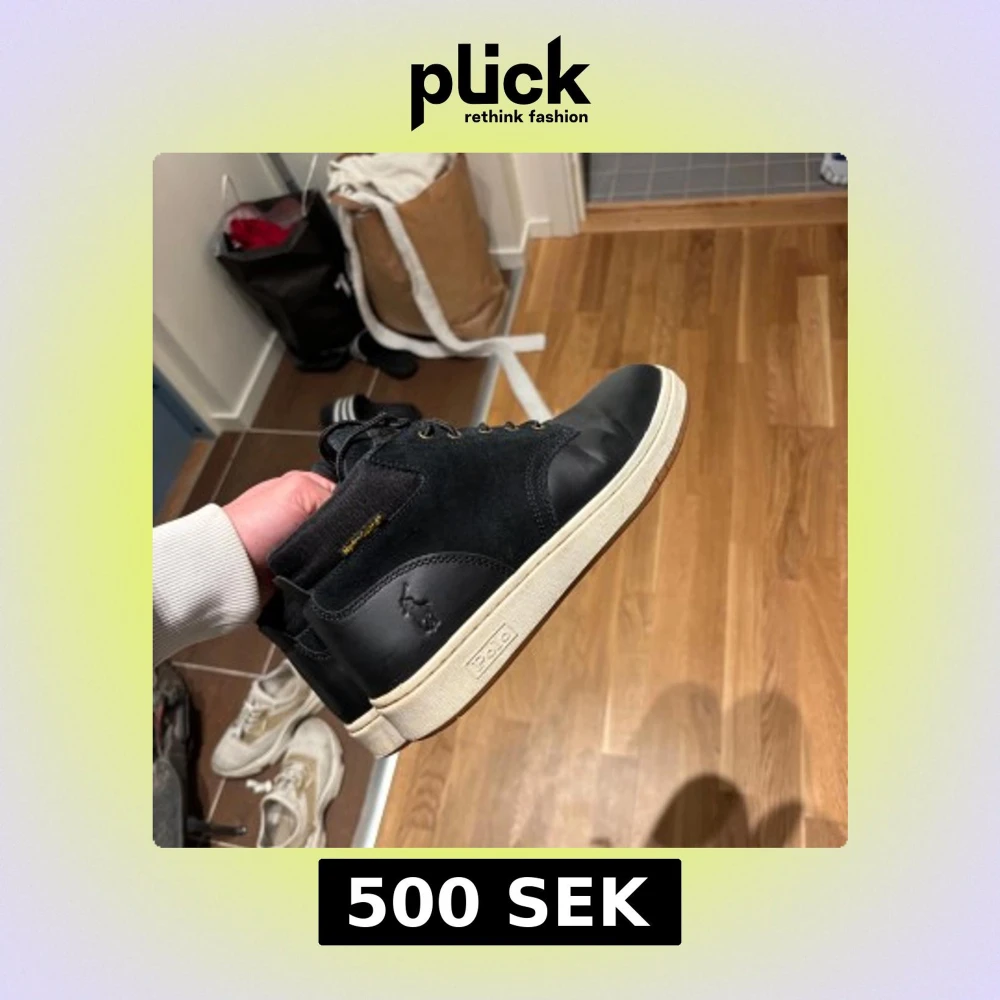 Säljer ett par svarta sneakers från Polo Ralph Lauren med vit sula och bruna detaljer på sulan. Skorna har snörning, rund tå och är tillverkade i en kombination av skinn och mocka. Klassisk Polo-logga på sidan och texten 'Polo' på sulan.