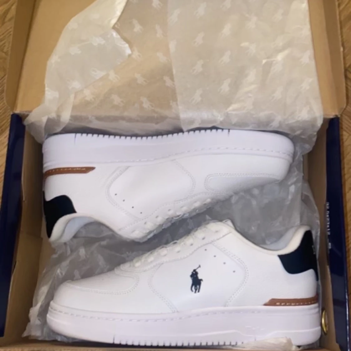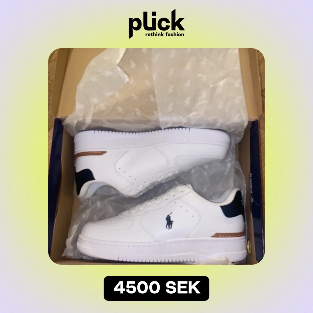 Snygga vita sneakers från Polo Ralph Lauren i nytt skick. De har en klassisk design med märkets ikoniska logga på sidan. Skorna är gjorda i syntetmaterial och har en stilren look med detaljer i svart och brunt. Perfekta för både vardag och fest!