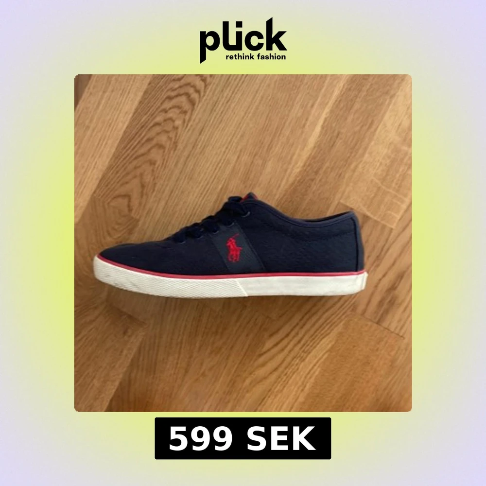 Snygga blå sneakers från Polo Ralph Lauren med röd logga och detaljer. Skorna har snörning och en vit sula som ger en fräsch look. Perfekta för en avslappnad stil.