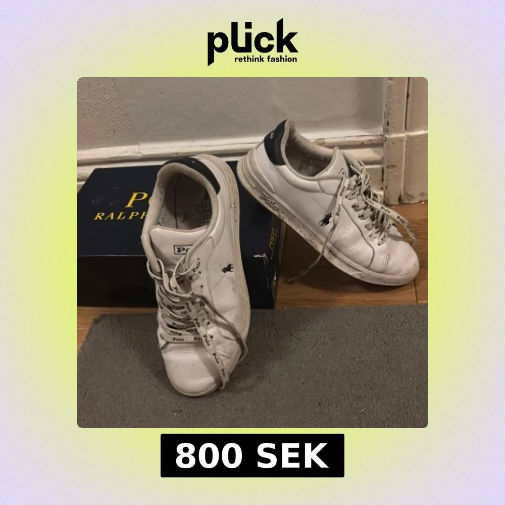 Snygga vita sneakers från Polo Ralph Lauren med svarta detaljer och Polo-logga på hälen. Skorna är i skinn med textilfoder och har klassisk snörning med Polo-tryck på skosnörena. Perfekta för en clean och stilren look. Lite smutsiga men inget mer än så.