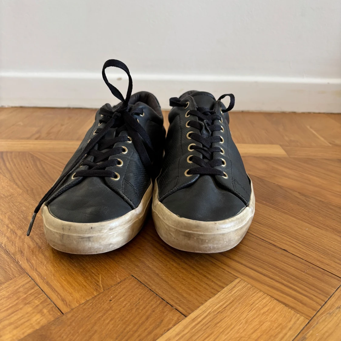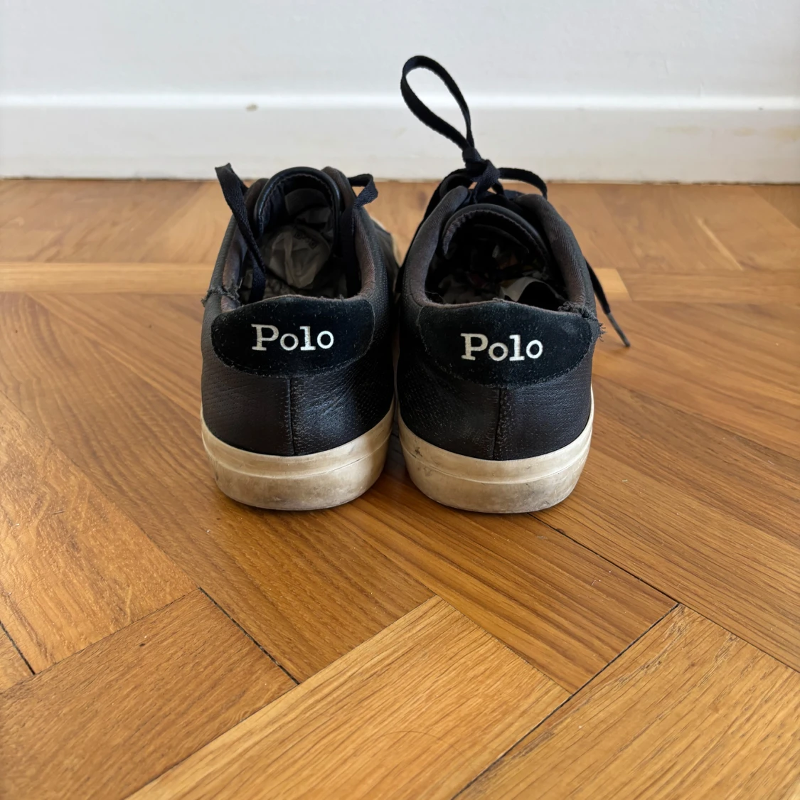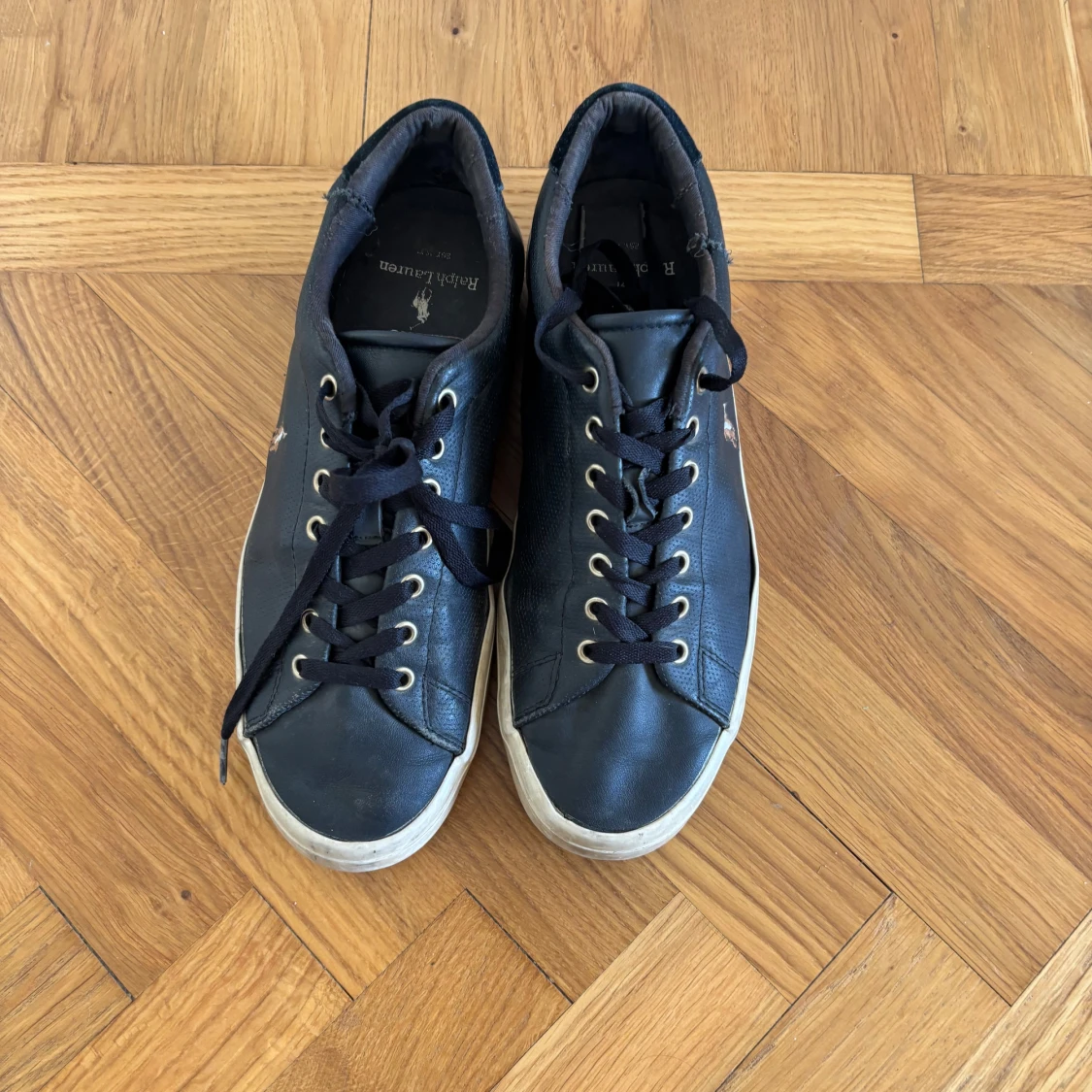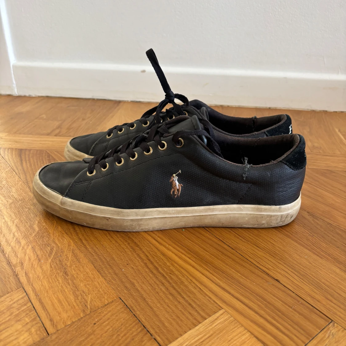 Svarta sneakers i skinn från Polo Ralph Lauren med klassisk logga broderad på sidan och Polo-text bak på hälen. Skorna har svarta snören, guldfärgade öljetter och vit sula. Perfekta för en stilren och avslappnad look.