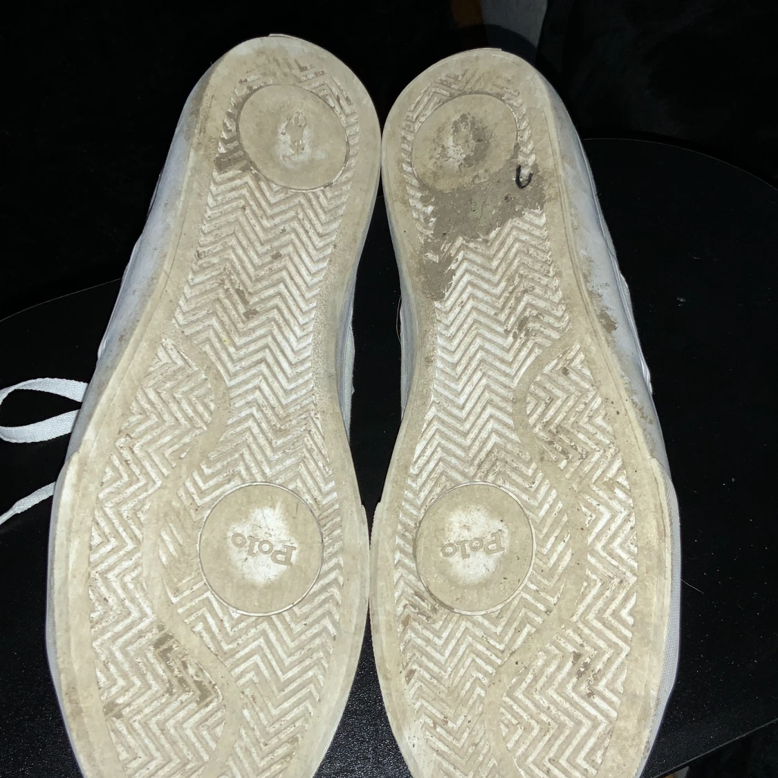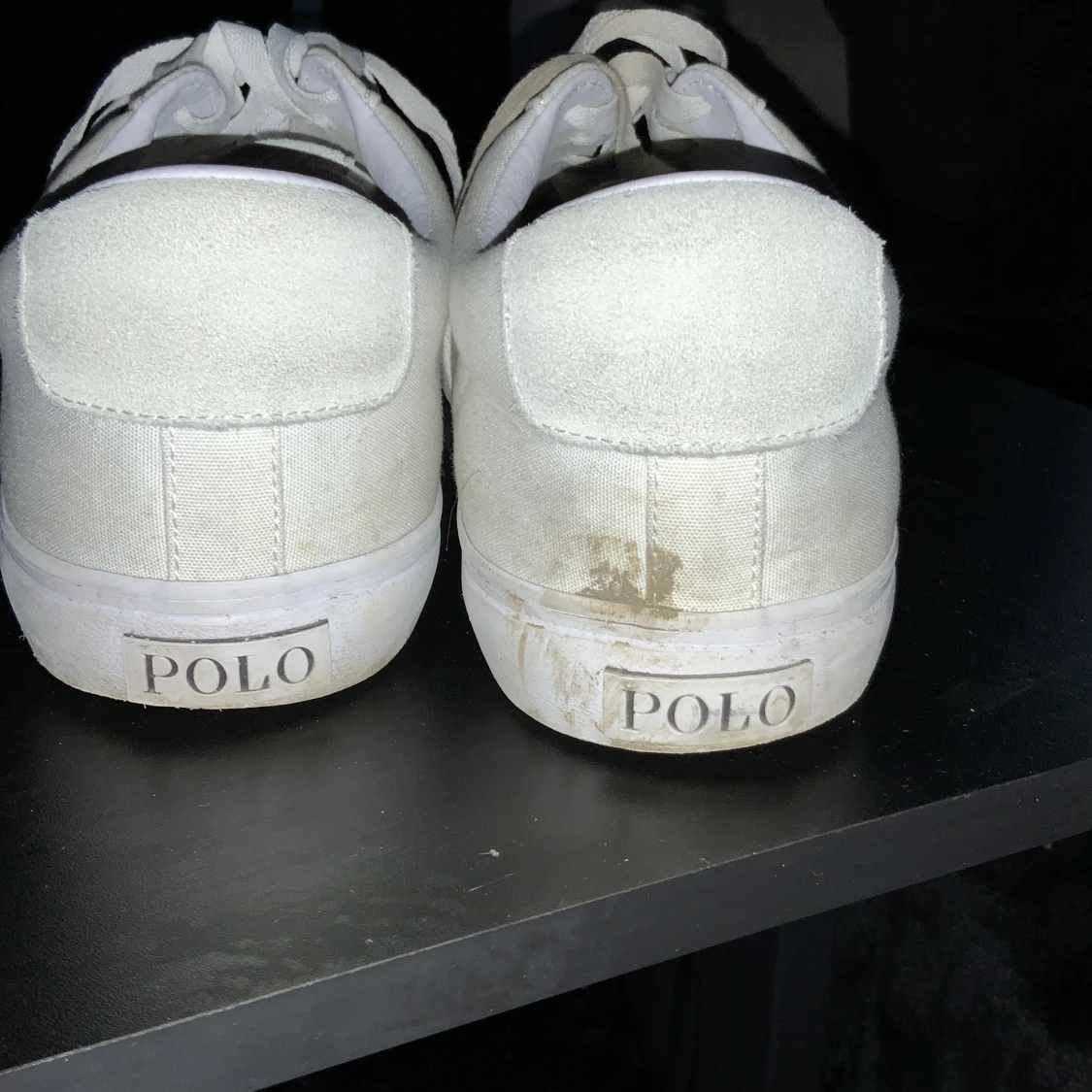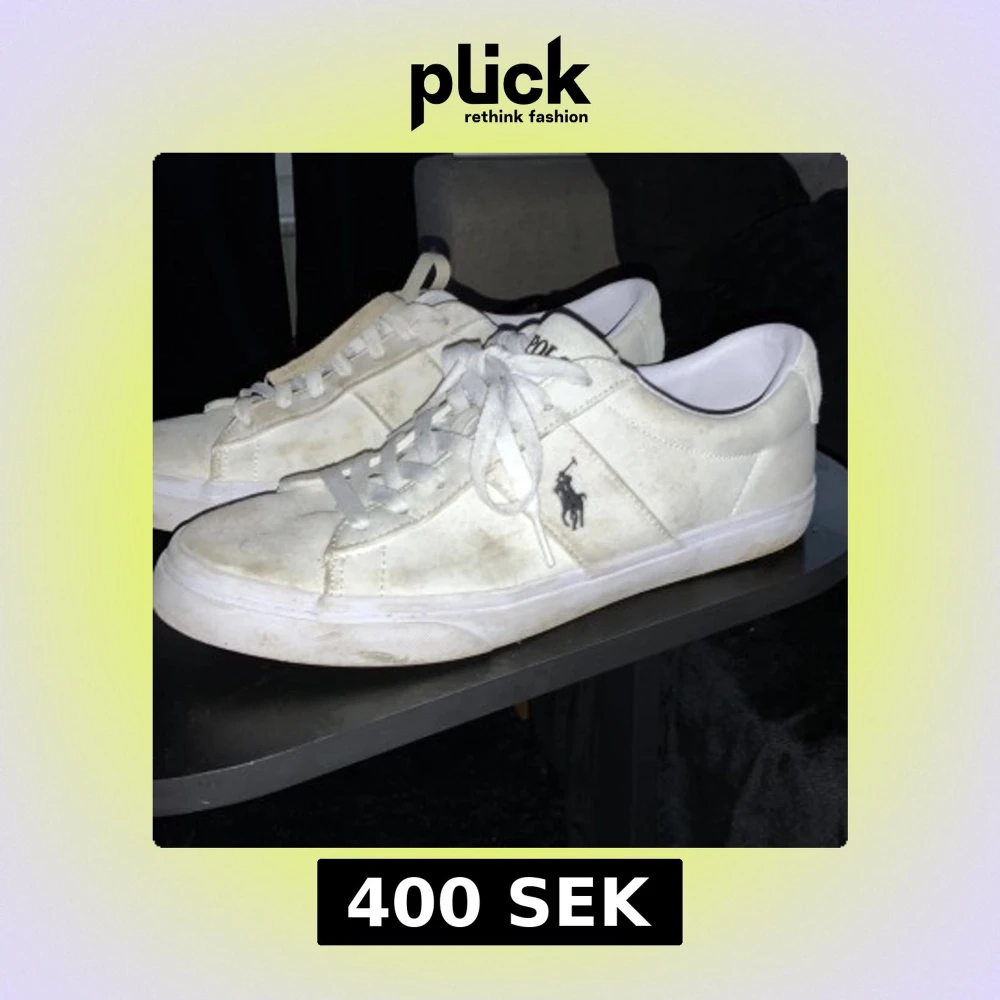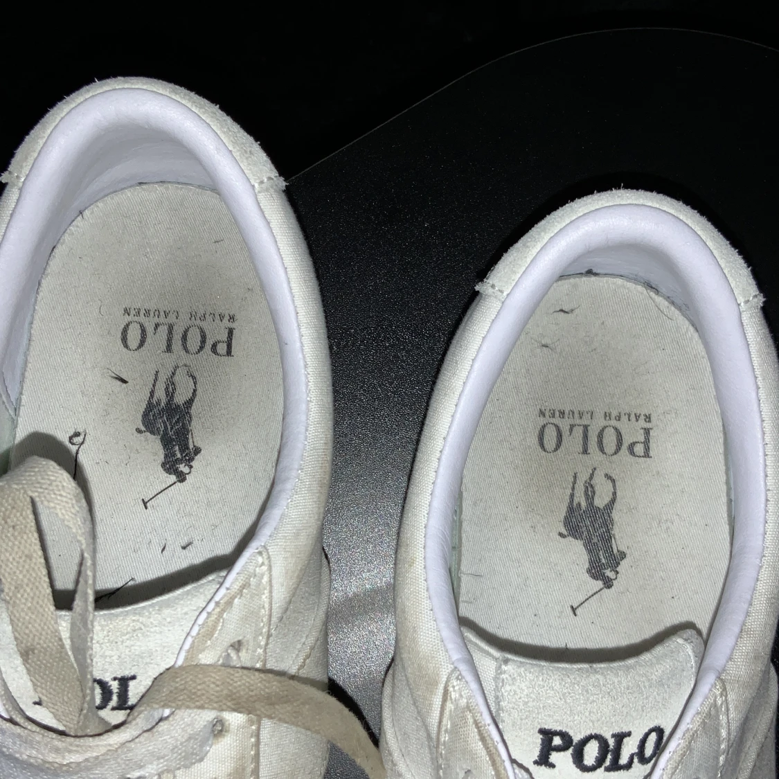 Säljer ett par klassiska vita sneakers från Polo Ralph Lauren med snörning och rund tå. Skorna har Polo-loggan broderad på sidan och märket tryckt på hälen. Perfekta till en avslappnad stil.