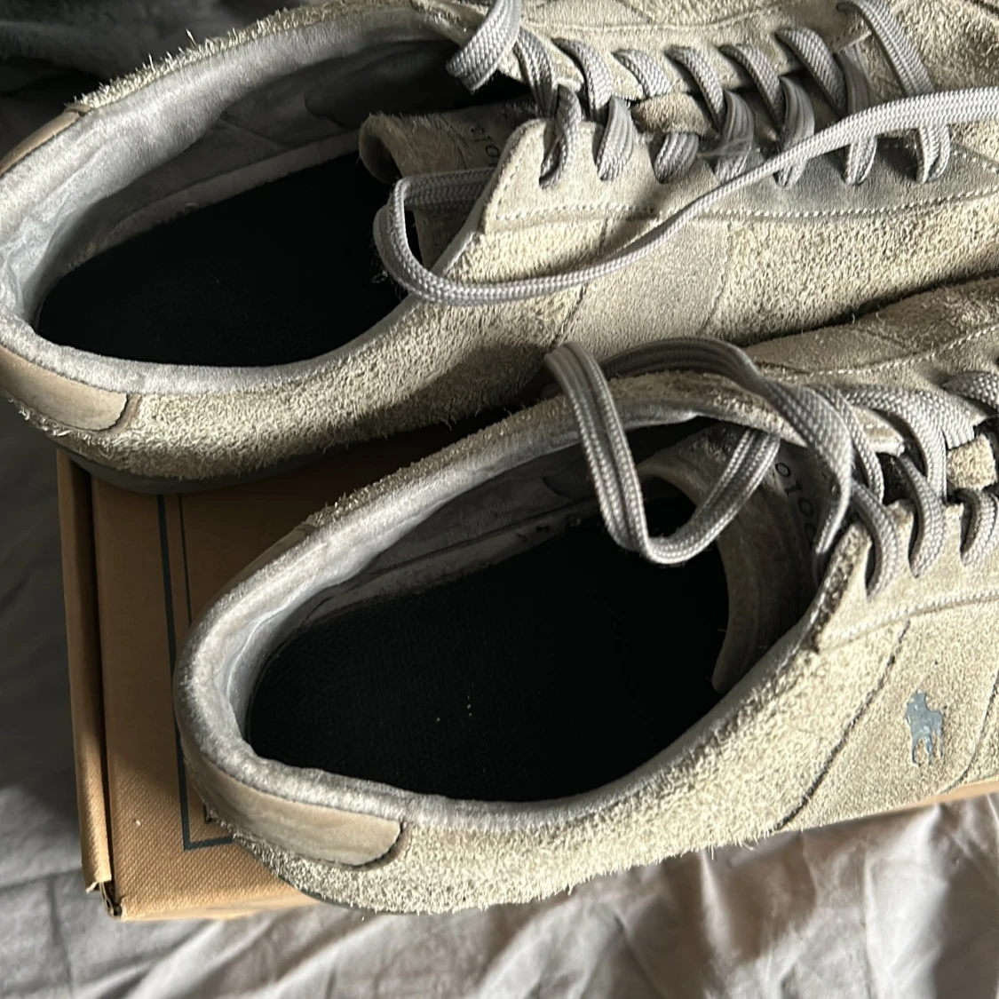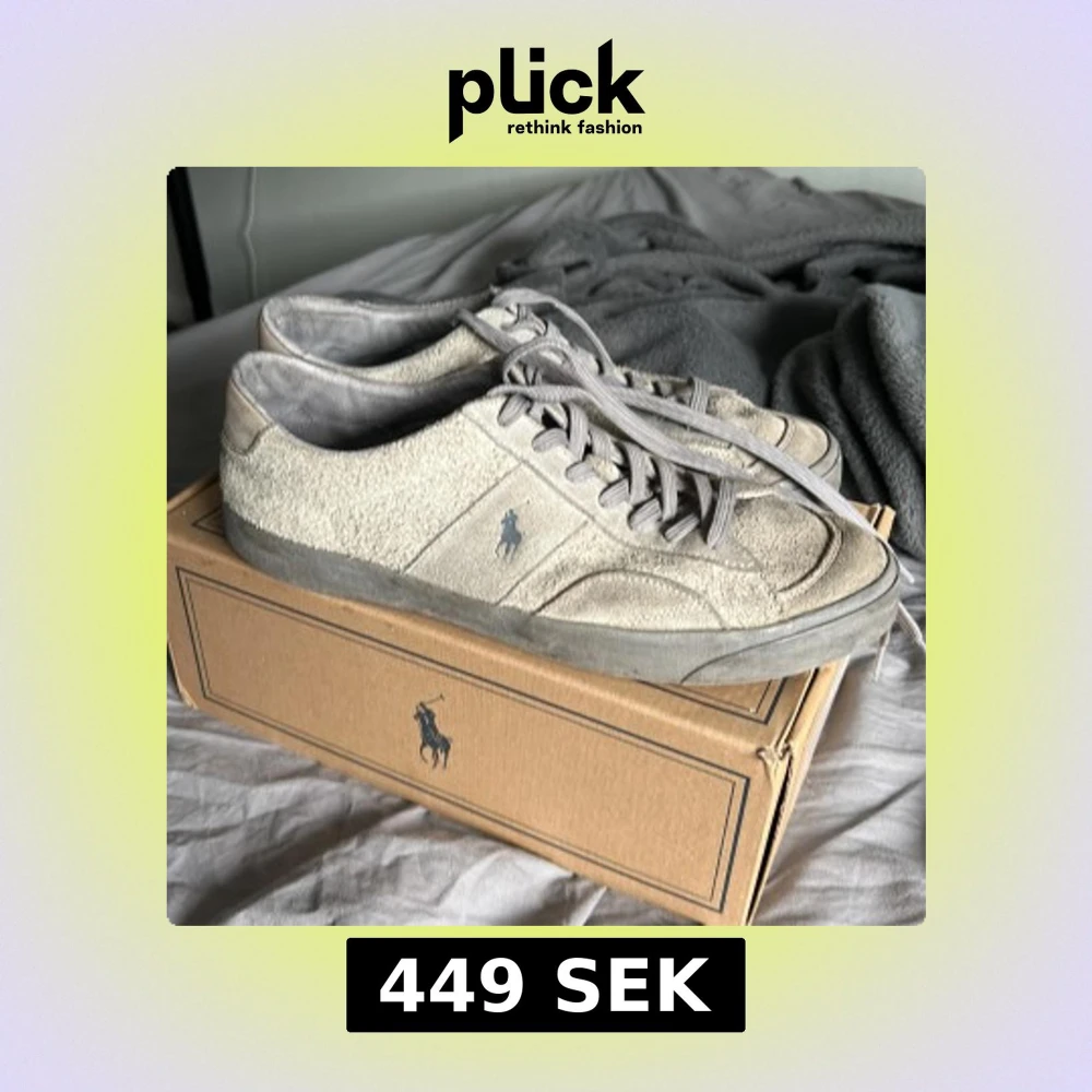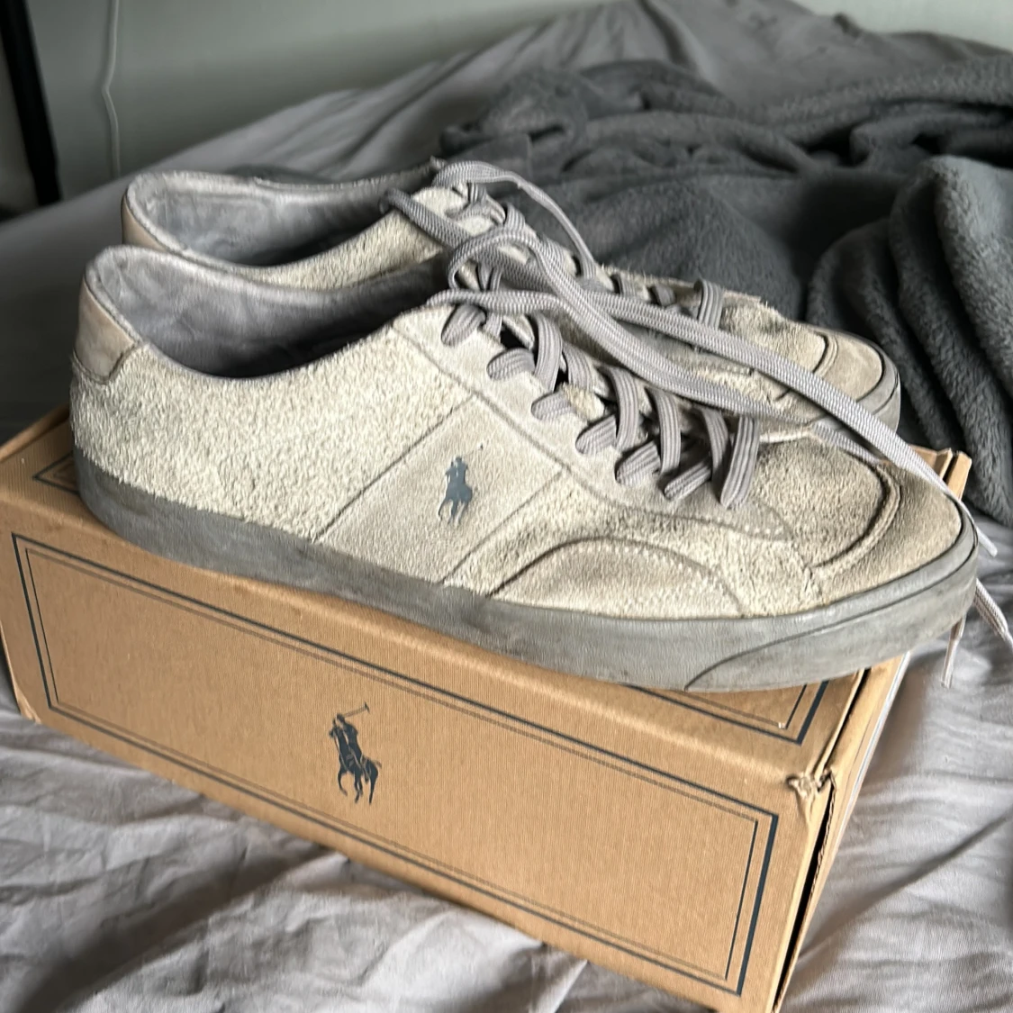 Snygga sneakers i beige mocka från Polo Ralph Lauren med klassisk logga på sidan. Skorna har grå snörning, platt sula och rund tå. Perfekta för dig som gillar stilrena och tidlösa sneakers med en touch av premiumkänsla.