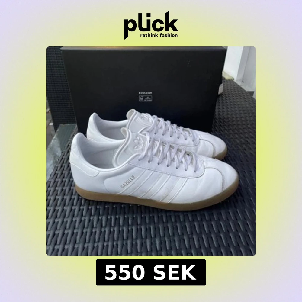 Snygga vita Adidas Gazelle sneakers i bra skick storlek 43, passar bra med de mesta. Skriv vid eventuella frĂ„gor đ