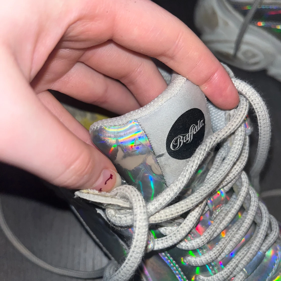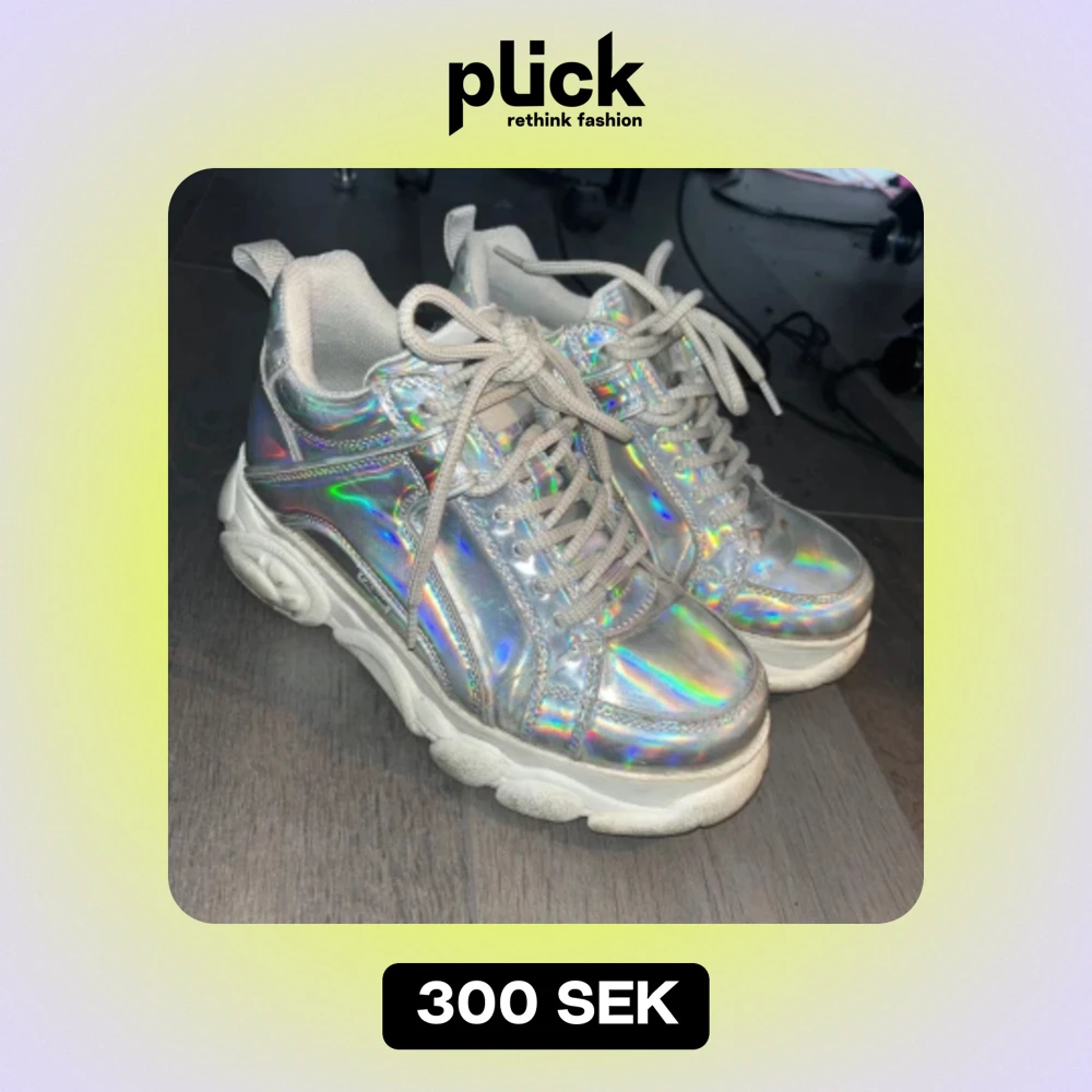 Jättefina holografiska skor från buffalo med en chunky sula. Det har tecken på användning då jag använt dem en hel vår säsong men det är inget fel på dem eller att de är trasig mest att sulan är lite smustig vilket går att lösa!