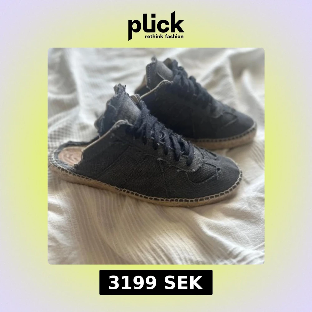 Unika svarta sneakers från Maison Margiela i jeansmaterial med snörning och rund tå. Skorna har en distinkt design med synliga sömmar och en espadrille-liknande sula. Perfekta för dig som vill ha något annorlunda och stilrent. Storlek 44 suveränt skick är mest ute för byten