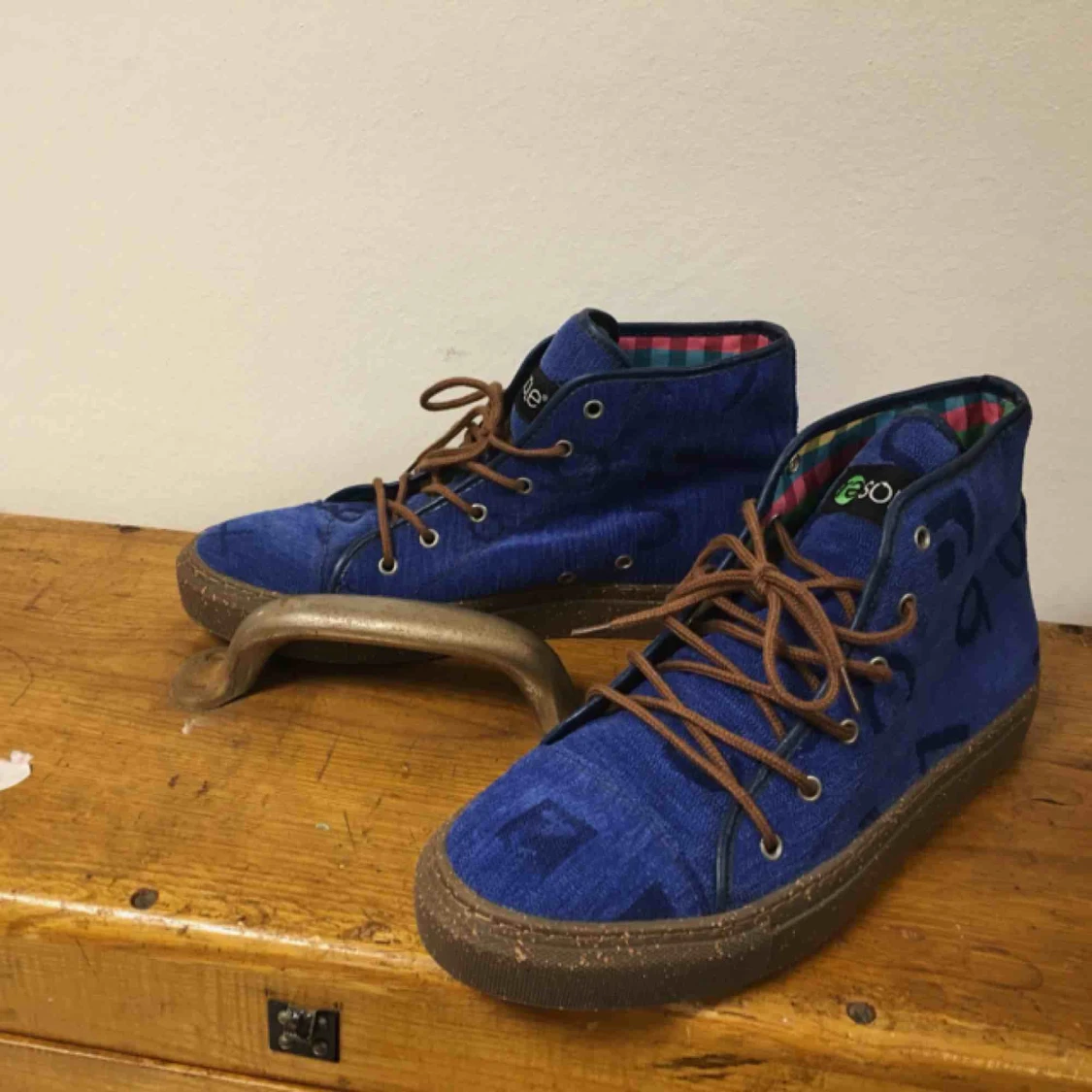 Re-Sole gör skor av gamla buss-säten, win win för den miljömedvetna som gillar återbruk. Sjukt nice brun sula, otroligt bekväma skor. Just dessa är gjorda av blå säten från bussarna i Göteborg. Skorna finns i Göteborg, kan skickas mot fraktkostnad.