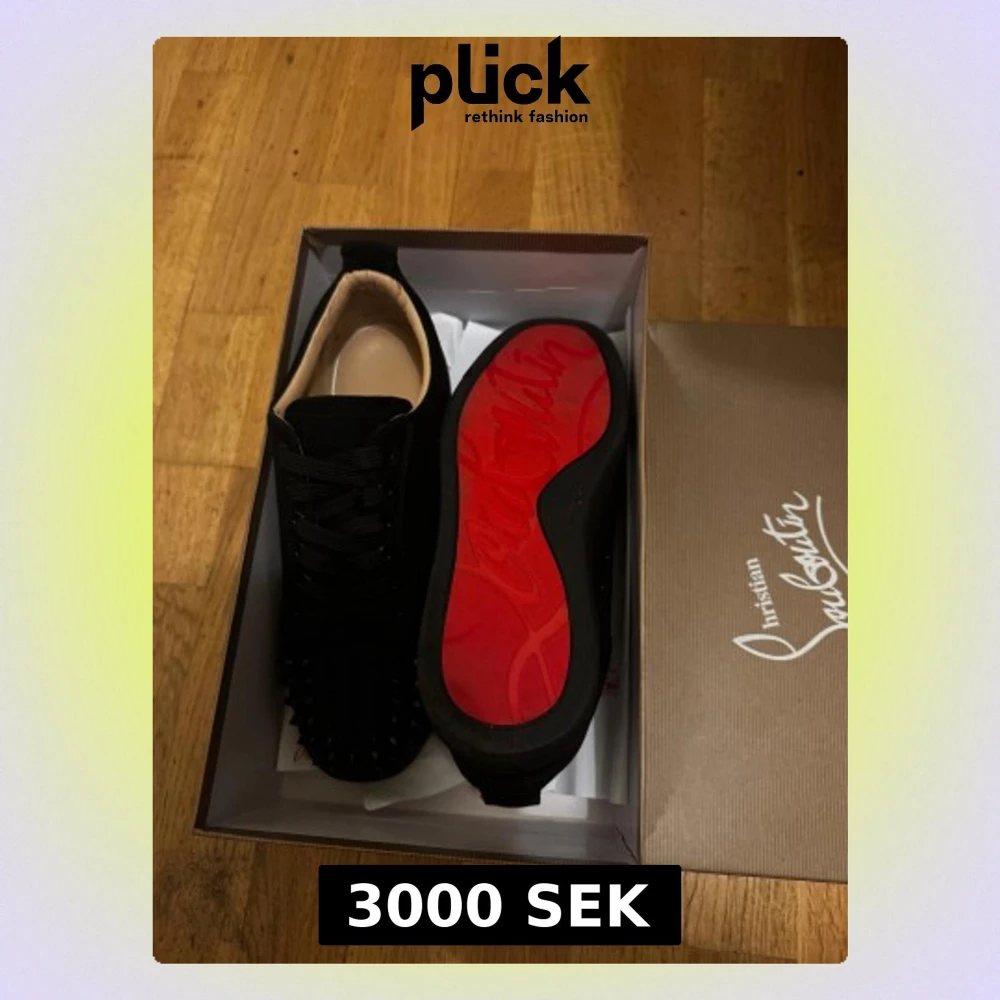 Svarta sneakers från Christian Louboutin med ikonisk röd sula och svarta nitar på tån. De är köpta i april 2025 på farfetch för 9468 kvittot finns och de har använt få tal gånger det är min ex skor och behöver inte de längre det är därför de säljs 😊😅