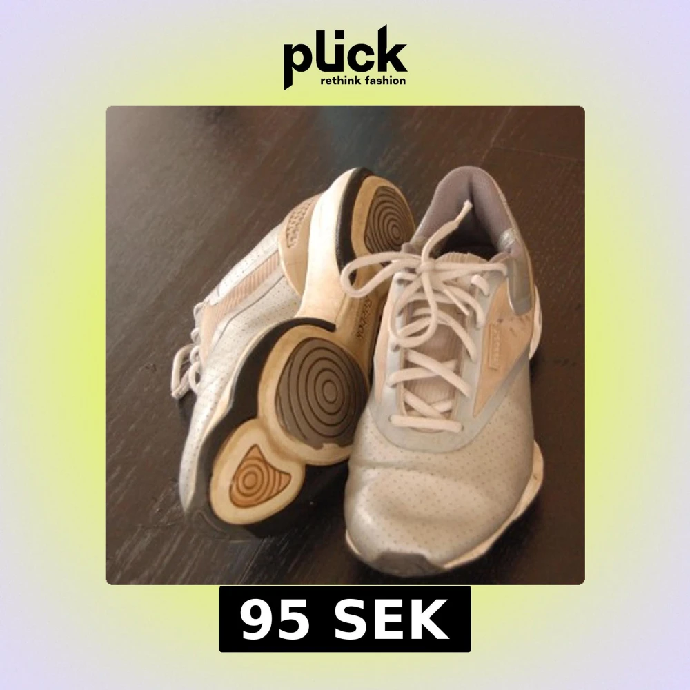 Säljer ett par grå sneakers från Reebok med vita snören och perforerat material på ovandelen. Skorna har en sula som är lite rundad vilket gör att rumpan tränas lite extra. Perfekta för vardagsbruk. Stl 39