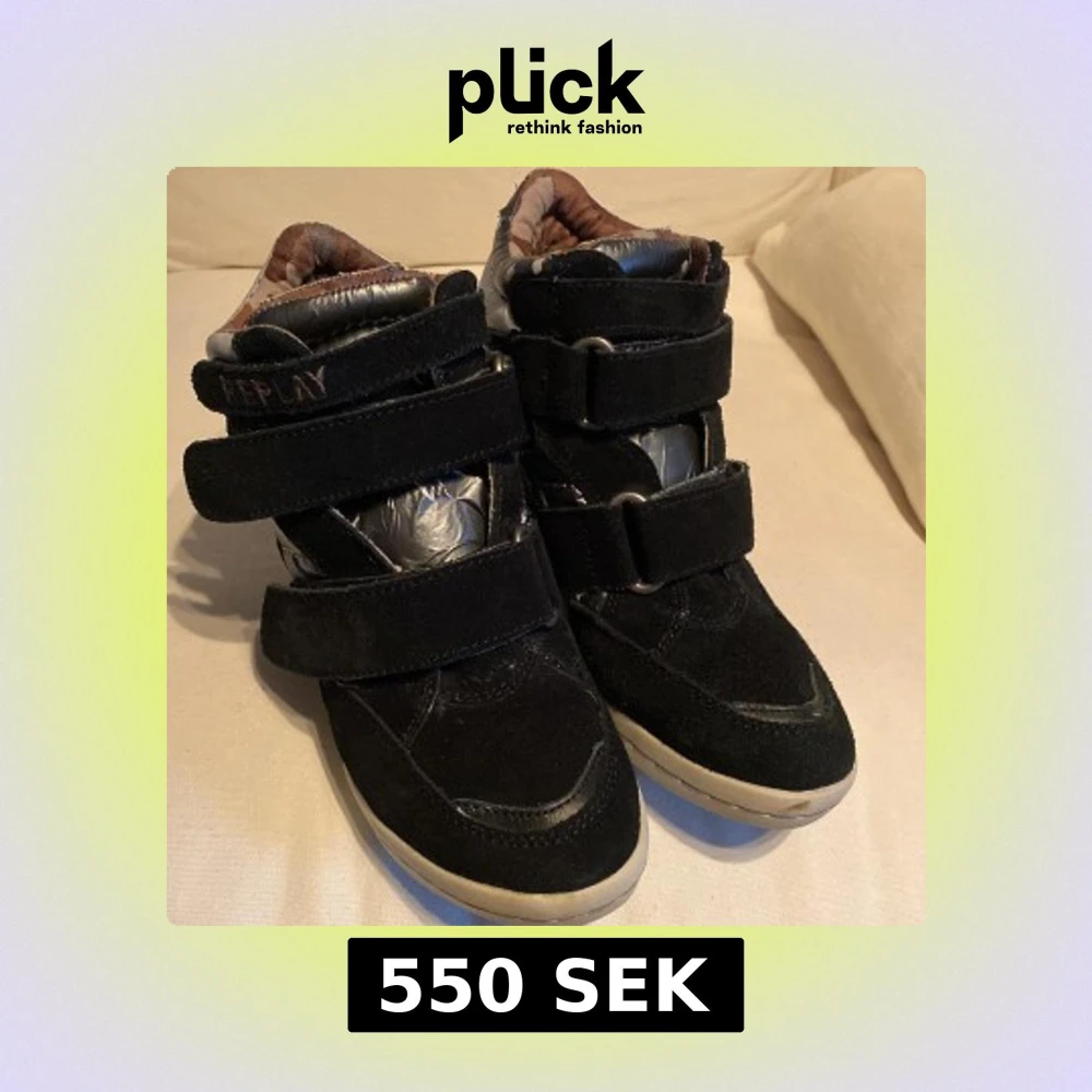Replay skor som är inspirerade av Isabel Marant skorna. Den gråa ”plasten” på skorna försvinner och har försökt rädda dem genom att skrapa bort lite men det går ej. Jag säljer den pga jag tycker att de är för låga i klack då dessa endast är 6cm höga🖤Annars super sköna och snygga!!
