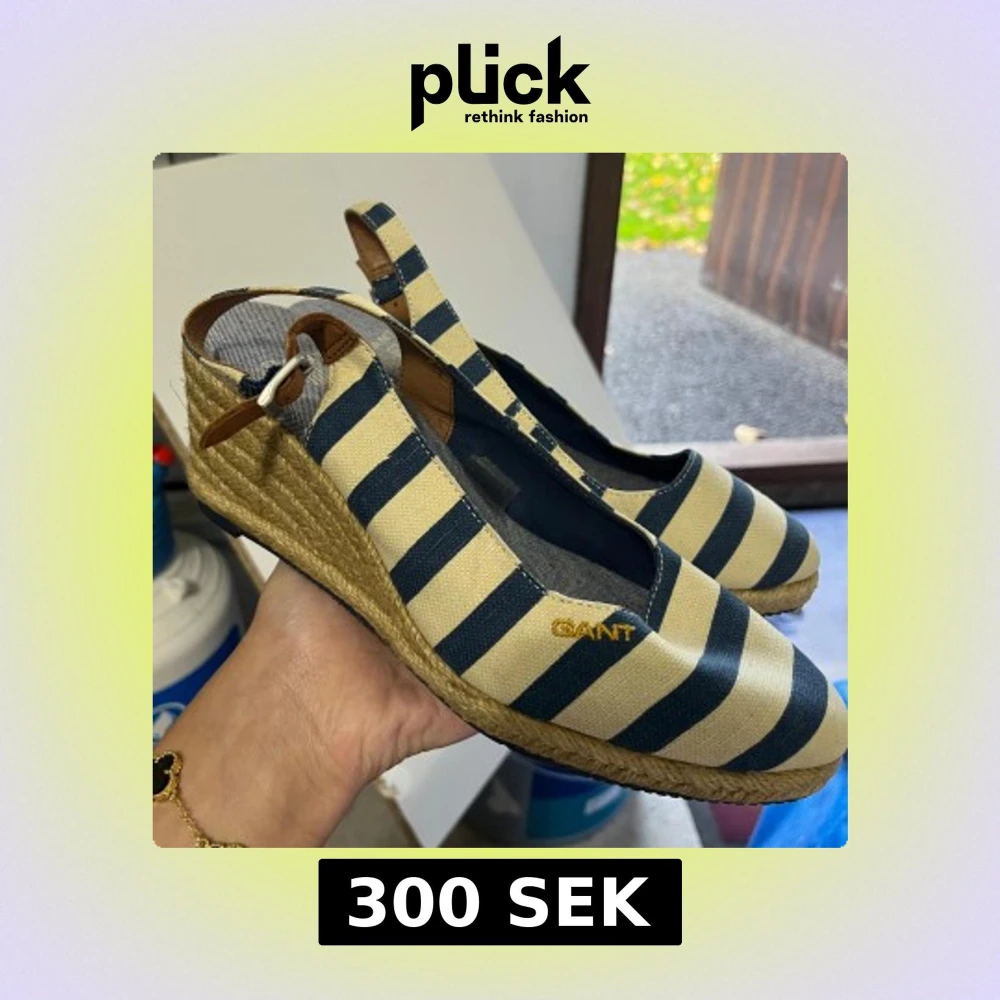 Snygga espadriller från Gant med marinblå och beige ränder, kilklack i rep och justerbar rem med spänne i brunt skinn. Ovandel i canvas och klassisk Gant-logga broderad i gult framtill. En sko är strl 36 och den andra 37, men de går att justera med remmen. Därav det billiga priset Helt nya endast testade.