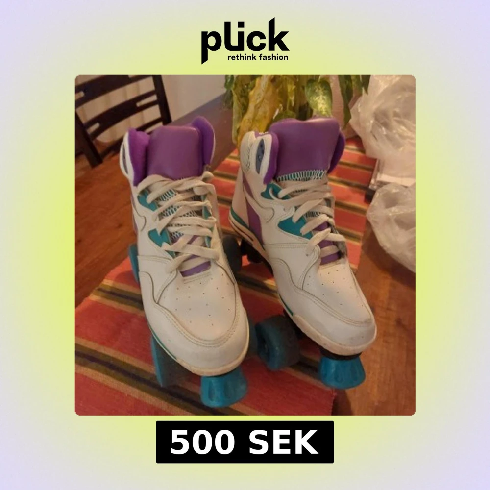 Snygga retro rullskridskor med en cool färgkombination av vitt, lila och turkos. De har snörning och en hög ankel för extra stöd.