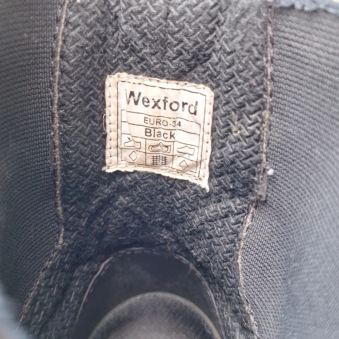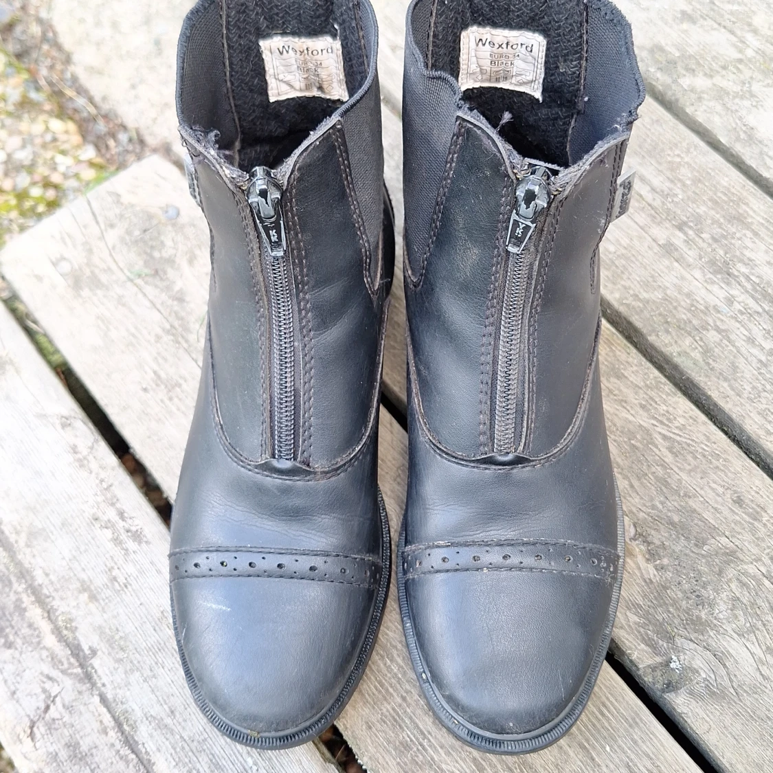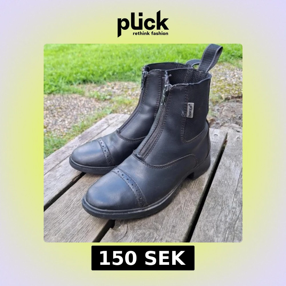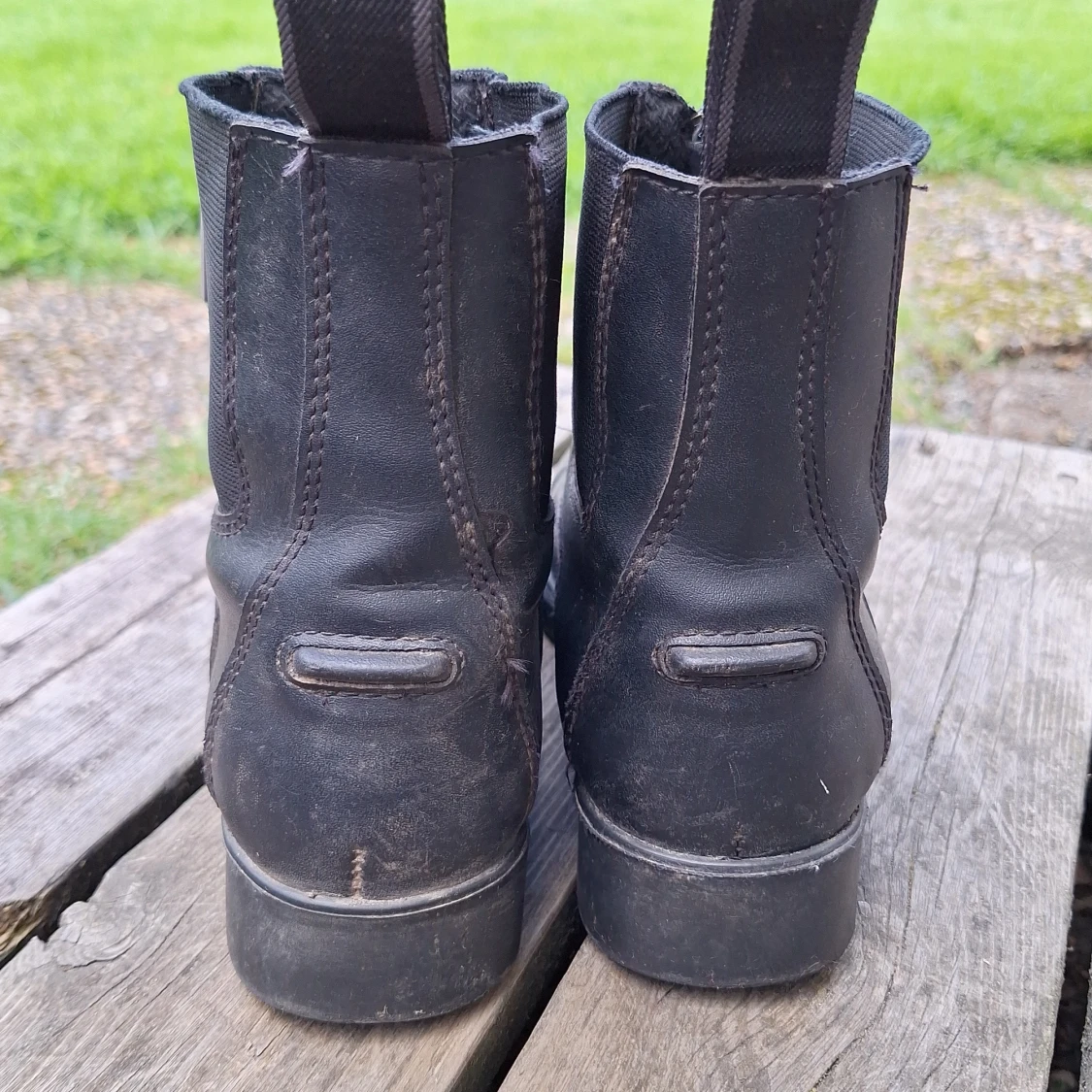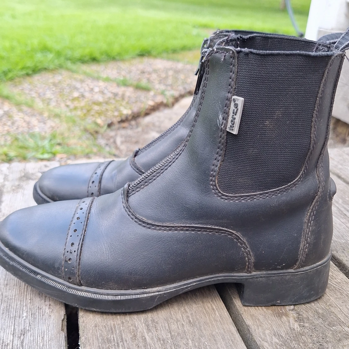 Snygga svarta ridstövletter i skinn från Wexford (Horze) med dragkedja framtill och elastiska paneler på sidorna. Stl 34. Dekorativa perforeringar på tån ger en klassisk look. Perfekta för dig som gillar ridning och vill ha stilrena boots.De har små fläckar men det syns på bilderna annats är de mycket fina!