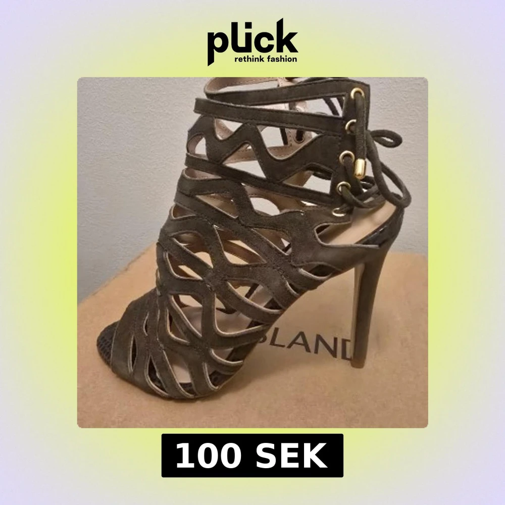 Säljer ett par khakigröna sandaler från River Island med höga klackar och öppen tå. Skorna har ett coolt utskuret mönster i mocka, snörning med gulddetaljer och plattformsula baktill. Perfekta för dig som vill sticka ut med en edgy stil.